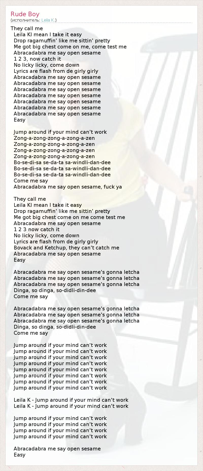 They call me Leila KI mean I take it easy Drop ragamuffin' like me sittin' pretty Me got big chest come on me, come test me Abracadabra me say open sesame 1 2 3, now catch it No licky licky, come down Lyrics are flash from de girly girly Abracadabra me say open sesame Abracadabra me say open sesame Abracadabra me say open sesame Abracadabra me say open sesame Abracadabra me say open sesame Abracadabra me say open sesame Abracadabra me say open sesame Easy Jump around if your mind can't work Zong-a-zong-zong-a-zong-a-zen Zong-a-zong-zong-a-zong-a-zen Zong-a-zong-zong-a-zong-a-zen Zong-a-zong-zong-a-zong-a-zen Bo-se-di-sa se-da-ta sa-windli-dan-dee Bo-se-di-sa se-da-ta sa-windli-dan-dee Bo-se-di-sa se-da-ta sa-windli-dan-dee Come me say Abracadabra me say open sesame, fuck ya They call me Leila KI mean I take it easy Drop ragamuffin' like me sittin' pretty Me got big chest come on me come test me Abracadabra me say open sesame 1 2 3 now catch it No licky licky, come down Lyrics are flash from de girly girly Bovack and Ketchup, they can't catch me Abracadabra me say open sesame Easy Abracadabra me say open sesame's gonna letcha Abracadabra me say open sesame's gonna letcha Abracadabra me say open sesame's gonna letcha Dinga, so dinga, so-didli-din-dee Come me say Abracadabra me say open sesame's gonna letcha Abracadabra me say open sesame's gonna letcha Abracadabra me say open sesame's gonna letcha Dinga, so dinga, so-didli-din-dee Come me say Jump around if your mind can't work Jump around if your mind can't work Jump around if your mind can't work Jump around if your mind can't work Jump around if your mind can't work Jump around if your mind can't work Jump around if your mind can't work Jump around if your mind can't work Leila K - Jump around if your mind can't work Leila K - Jump around if your mind can't work Jump around if your mind can't work Jump around if your mind can't work Jump around if your mind can't work Jump around if your mind can't work Abracadabra me say open sesame Easy