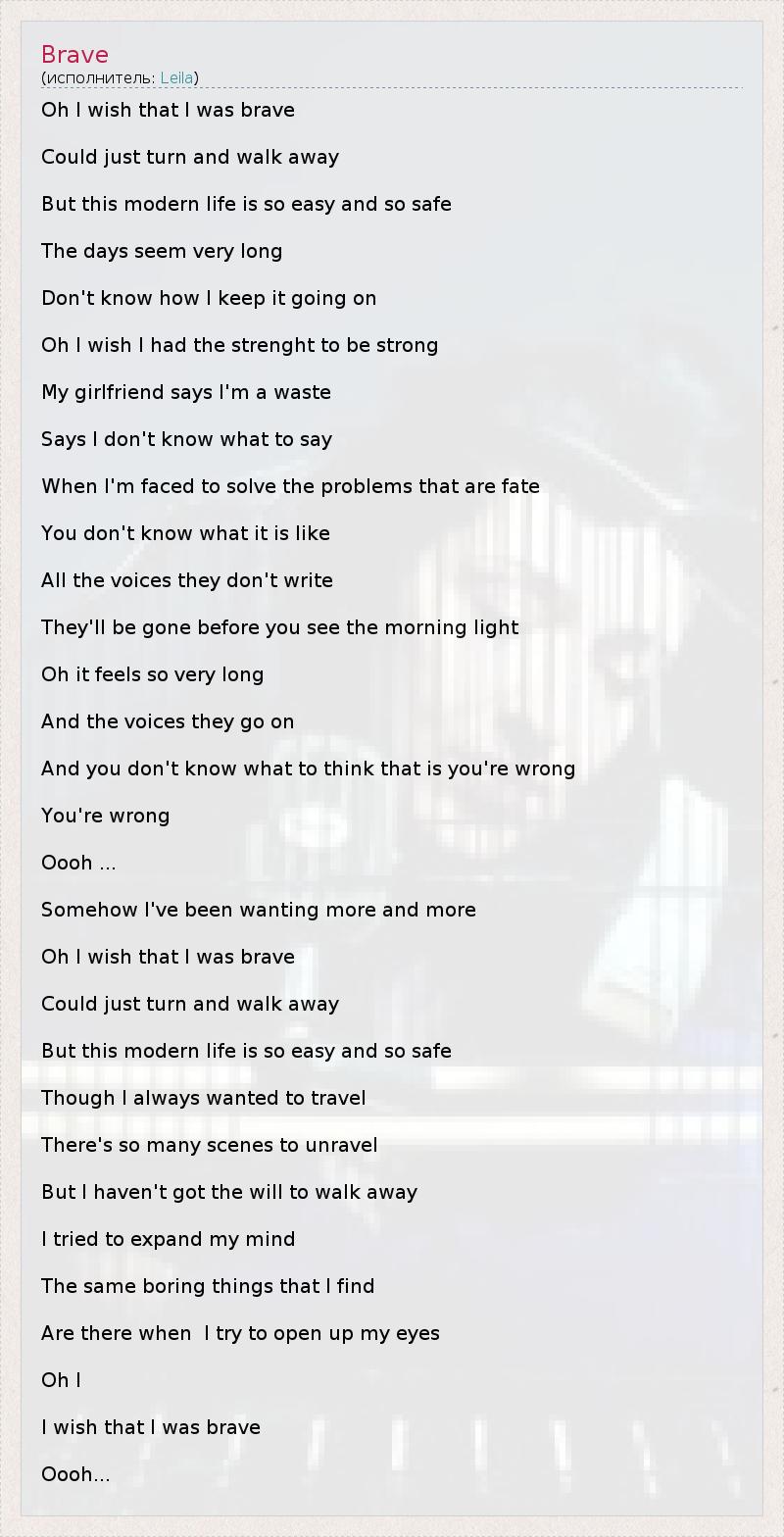 Oh I wish that I was brave Could just turn and walk away But this modern life is so easy and so safe The days seem very long Don't know how I keep it going on Oh I wish I had the strenght to be strong My girlfriend says I'm a waste Says I don't know what to say When I'm faced to solve the problems that are fate You don't know what it is like All the voices they don't write They'll be gone before you see the morning light Oh it feels so very long And the voices they go on And you don't know what to think that is you're wrong You're wrong Oooh ... Somehow I've been wanting more and more Oh I wish that I was brave Could just turn and walk away But this modern life is so easy and so safe Though I always wanted to travel There's so many scenes to unravel But I haven't got the will to walk away I tried to expand my mind The same boring things that I find Are there when I try to open up my eyes Oh I I wish that I was brave Oooh...