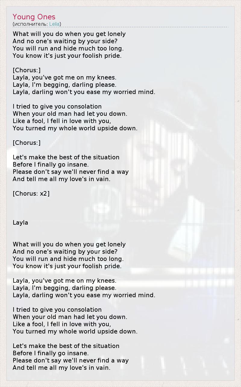 Что ты будешь делать, когда останешься одна, И никого не будет рядом? Ты убежишь и будешь очень долго прятаться. Ты знаешь, что это всего лишь твоя глупая гордость. [Припев:] Лайла, из-за тебя я стою на коленях. Лайла, я умоляю тебя, пожалуйста, дорогая. Лайла, дорогая, не облегчишь ли ты мои напряженные думы? Я пытался тебя утешить, Когда твой бывший бросил тебя. Словно дурак, я влюбился в тебя, Ты перевернула мой мир. [Припев:] Давай улучшим нашу ситуацию, Пока я вконец не сошел с ума. Пожалуйста не говори, что мы не найдем общего пути, И скажи мне, что моя любовь напрасна. [Припев: 2 раза] Лейла* (перевод Константин Седельников из Комсомольска-на-Амуре) Что если станешь одинокой, И будет некому обнять? Ты убежишь, надолго спрячешься. Ты хочешь гордость показать. Лейла, я пред тобою ниц. Лейла, молю тебя, очнись. Лейла, детка, успокой мою печаль. Старался дать я утешенье, Когда твой друг с тобой порвал. И как дитя, в тебя влюбился я, С тобой свой мир я потерял. Давай с тобою всё улучшим, Пока с ума я не сошёл. Не говори, что нет у нас пути, Что зря любовь свою обрёл. * - Поэтический перевод