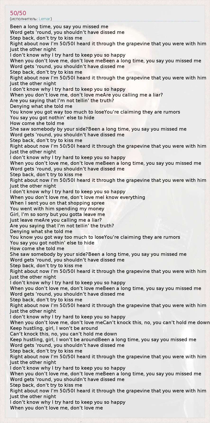 Been a long time, you say you missed me Word gets 'round, you shouldn't have dissed me Step back, don't try to kiss me Right about now I'm 50/50I heard it through the grapevine that you were with him Just the other night I don't know why I try hard to keep you so happy When you don't love me, don't love meBeen a long time, you say you missed me Word gets 'round, you shouldn't have dissed me Step back, don't try to kiss me Right about now I'm 50/50I heard it through the grapevine that you were with him Just the other night I don't know why I try hard to keep you so happy When you don't love me, don't love meAre you calling me a liar? Are you saying that I'm not tellin' the truth? Denying what she told me You know you got way too much to loseYou're claiming they are rumors You say you got nothin' else to hide How come she told me She saw somebody by your side?Been a long time, you say you missed me Word gets 'round, you shouldn't have dissed me Step back, don't try to kiss me Right about now I'm 50/50I heard it through the grapevine that you were with him Just the other night I don't know why I try hard to keep you so happy When you don't love me, don't love meBeen a long time, you say you missed me Word gets 'round, you shouldn't have dissed me Step back, don't try to kiss me Right about now I'm 50/50I heard it through the grapevine that you were with him Just the other night I don't know why I try hard to keep you so happy When you don't love me, don't love meI know everything When I sent you on that shopping spree You went with him spending my money Girl, I'm so sorry but you gotta leave me Just leave meAre you calling me a liar? Are you saying that I'm not tellin' the truth? Denying what she told me You know you got way too much to loseYou're claiming they are rumors You say you got nothin' else to hide How come she told me She saw somebody by your side?Been a long time, you say you missed me Word gets 'round, you shouldn't have dissed me Step back, don't try to kiss me Right about now I'm 50/50I heard it through the grapevine that you were with him Just the other night I don't know why I try hard to keep you so happy When you don't love me, don't love meBeen a long time, you say you missed me Word gets 'round, you shouldn't have dissed me Step back, don't try to kiss me Right about now I'm 50/50I heard it through the grapevine that you were with him Just the other night I don't know why I try hard to keep you so happy When you don't love me, don't love meCan't knock this, no, you can't hold me down Keep hustling, girl, I won't be around Can't knock this, no, you can't hold me down Keep hustling, girl, I won't be aroundBeen a long time, you say you missed me Word gets 'round, you shouldn't have dissed me Step back, don't try to kiss me Right about now I'm 50/50I heard it through the grapevine that you were with him Just the other night I don't know why I try hard to keep you so happy When you don't love me, don't love meBeen a long time, you say you missed me Word gets 'round, you shouldn't have dissed me Step back, don't try to kiss me Right about now I'm 50/50I heard it through the grapevine that you were with him Just the other night I don't know why I try hard to keep you so happy When you don't love me, don't love me
