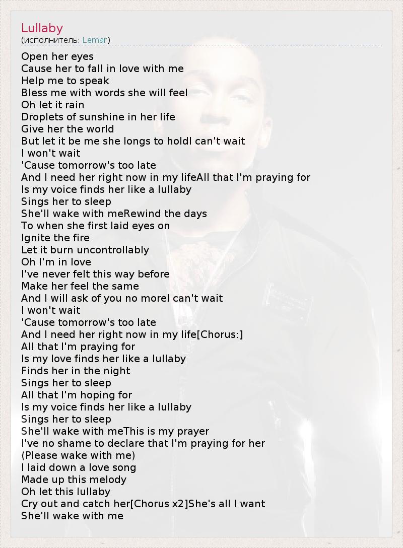 Open her eyes Cause her to fall in love with me Help me to speak Bless me with words she will feel Oh let it rain Droplets of sunshine in her life Give her the world But let it be me she longs to holdI can't wait I won't wait 'Cause tomorrow's too late And I need her right now in my lifeAll that I'm praying for Is my voice finds her like a lullaby Sings her to sleep She'll wake with meRewind the days To when she first laid eyes on Ignite the fire Let it burn uncontrollably Oh I'm in love I've never felt this way before Make her feel the same And I will ask of you no moreI can't wait I won't wait 'Cause tomorrow's too late And I need her right now in my life[Chorus:] All that I'm praying for Is my love finds her like a lullaby Finds her in the night Sings her to sleep All that I'm hoping for Is my voice finds her like a lullaby Sings her to sleep She'll wake with meThis is my prayer I've no shame to declare that I'm praying for her (Please wake with me) I laid down a love song Made up this melody Oh let this lullaby Cry out and catch her[Chorus x2]She's all I want She'll wake with me