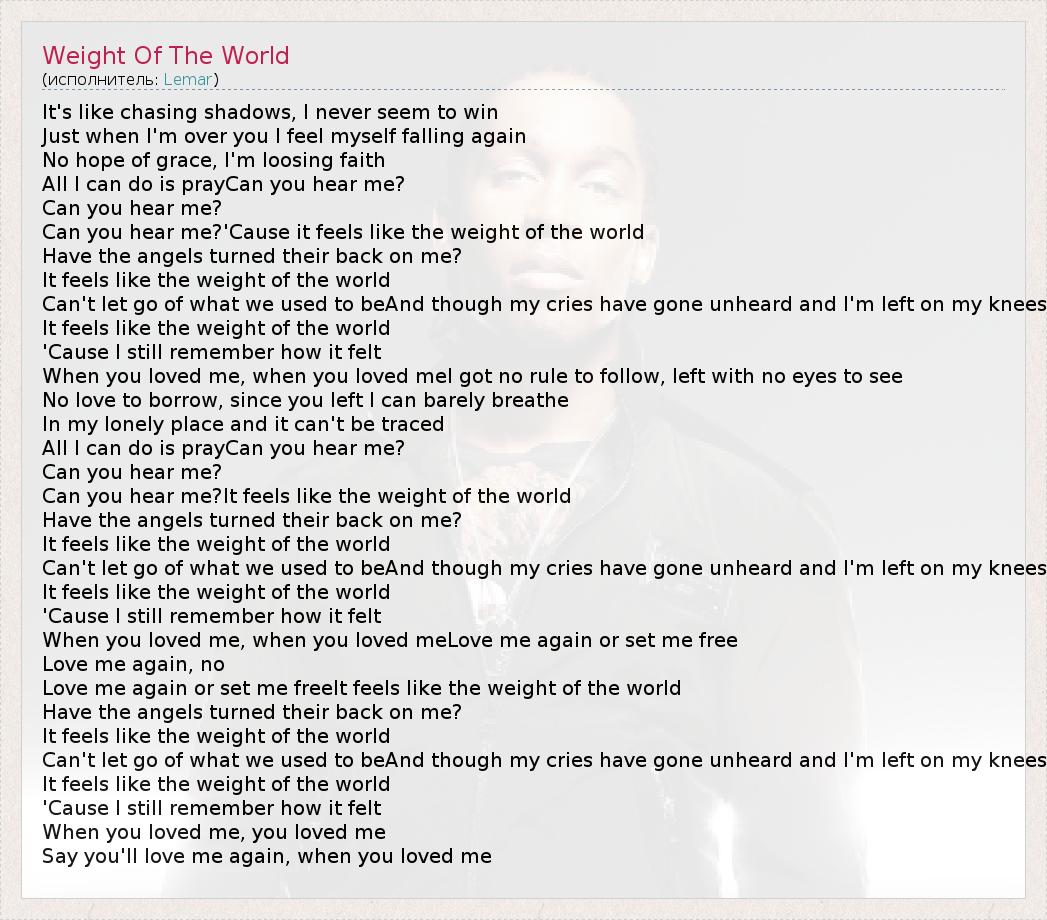 It's like chasing shadows, I never seem to win Just when I'm over you I feel myself falling again No hope of grace, I'm loosing faith All I can do is prayCan you hear me? Can you hear me? Can you hear me?'Cause it feels like the weight of the world Have the angels turned their back on me? It feels like the weight of the world Can't let go of what we used to beAnd though my cries have gone unheard and I'm left on my knees It feels like the weight of the world 'Cause I still remember how it felt When you loved me, when you loved meI got no rule to follow, left with no eyes to see No love to borrow, since you left I can barely breathe In my lonely place and it can't be traced All I can do is prayCan you hear me? Can you hear me? Can you hear me?It feels like the weight of the world Have the angels turned their back on me? It feels like the weight of the world Can't let go of what we used to beAnd though my cries have gone unheard and I'm left on my knees It feels like the weight of the world 'Cause I still remember how it felt When you loved me, when you loved meLove me again or set me free Love me again, no Love me again or set me freeIt feels like the weight of the world Have the angels turned their back on me? It feels like the weight of the world Can't let go of what we used to beAnd though my cries have gone unheard and I'm left on my knees It feels like the weight of the world 'Cause I still remember how it felt When you loved me, you loved me Say you'll love me again, when you loved me