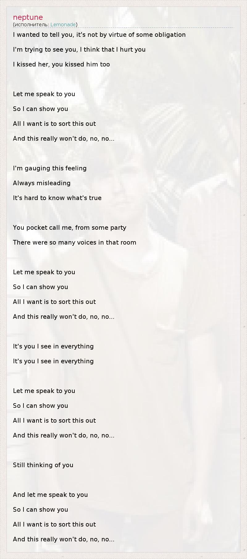 I wanted to tell you, it's not by virtue of some obligation I'm trying to see you, I think that I hurt you I kissed her, you kissed him too Let me speak to you So I can show you All I want is to sort this out And this really won't do, no, no... I'm gauging this feeling Always misleading It's hard to know what's true You pocket call me, from some party There were so many voices in that room Let me speak to you So I can show you All I want is to sort this out And this really won't do, no, no... It's you I see in everything It's you I see in everything Let me speak to you So I can show you All I want is to sort this out And this really won't do, no, no... Still thinking of you And let me speak to you So I can show you All I want is to sort this out And this really won't do, no, no...