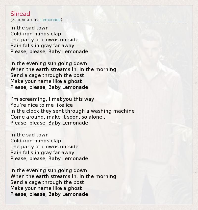 В этом сумрачном городе Холодные железные ладони Хлопают клоунам, играющим снаружи, И серый дождь льет, куда хватает взгляда. Прошу тебя, прошу тебя, Малютка Лимонад. Вечером солнце закатывается, И земля утекает за ним следом поутру. Я отправил железную клетку тебе по почте - Твое призрачное имя - Прошу тебя, прошу тебя, Малютка Лимонад! Я кричу о том, как встретил тебя - Ты хороша для меня, словно лед В часах, которые они пропускают через стиральную машину - Приди скорее, мне так одиноко. Прошу тебя, прошу тебя, Малютка Лимонад! В этом сумрачном городе Холодные железные ладони Хлопают клоунам, играющим снаружи, И серый дождь льет, куда хватает взгляда. Прошу тебя, прошу тебя, Малютка Лимонад. Вечером солнце закатывается, И земля утекает за ним следом поутру. Я отправил железную клетку тебе по почте - Твое призрачное имя - Прошу тебя, прошу тебя, Малютка Лимонад!
