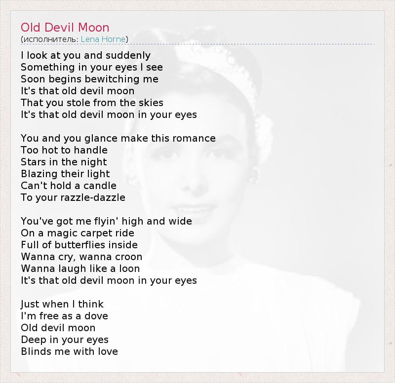 I look at you and suddenly Something in your eyes I see Soon begins bewitching me It's that old devil moon That you stole from the skies It's that old devil moon in your eyes You and you glance make this romance Too hot to handle Stars in the night Blazing their light Can't hold a candle To your razzle-dazzle You've got me flyin' high and wide On a magic carpet ride Full of butterflies inside Wanna cry, wanna croon Wanna laugh like a loon It's that old devil moon in your eyes Just when I think I'm free as a dove Old devil moon Deep in your eyes Blinds me with love