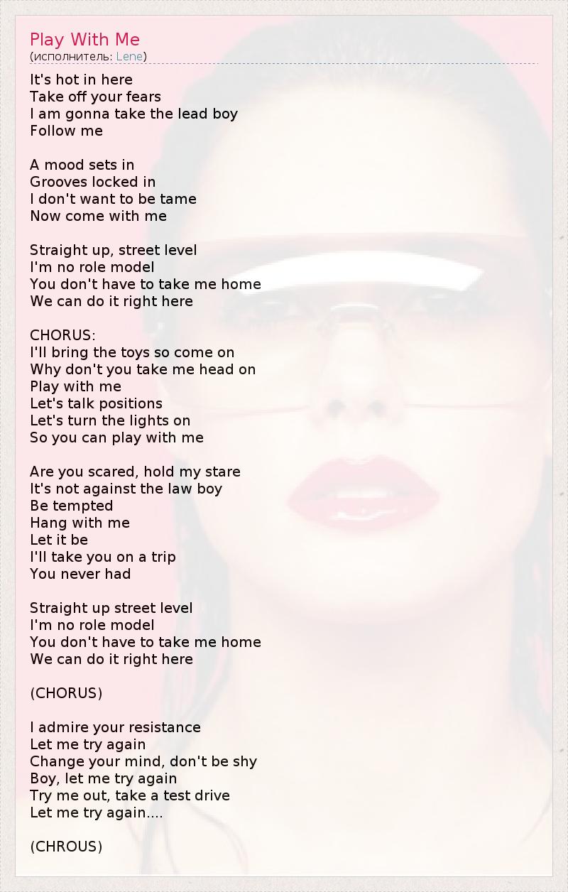 It's hot in here Take off your fears I am gonna take the lead boy Follow me A mood sets in Grooves locked in I don't want to be tame Now come with me Straight up, street level I'm no role model You don't have to take me home We can do it right here CHORUS: I'll bring the toys so come on Why don't you take me head on Play with me Let's talk positions Let's turn the lights on So you can play with me Are you scared, hold my stare It's not against the law boy Be tempted Hang with me Let it be I'll take you on a trip You never had Straight up street level I'm no role model You don't have to take me home We can do it right here (CHORUS) I admire your resistance Let me try again Change your mind, don't be shy Boy, let me try again Try me out, take a test drive Let me try again.... (CHROUS)