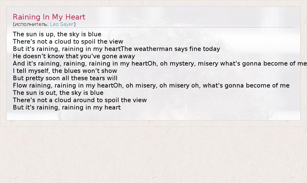 А как ты думаешь, о чем песня "Raining In My Heart" ?