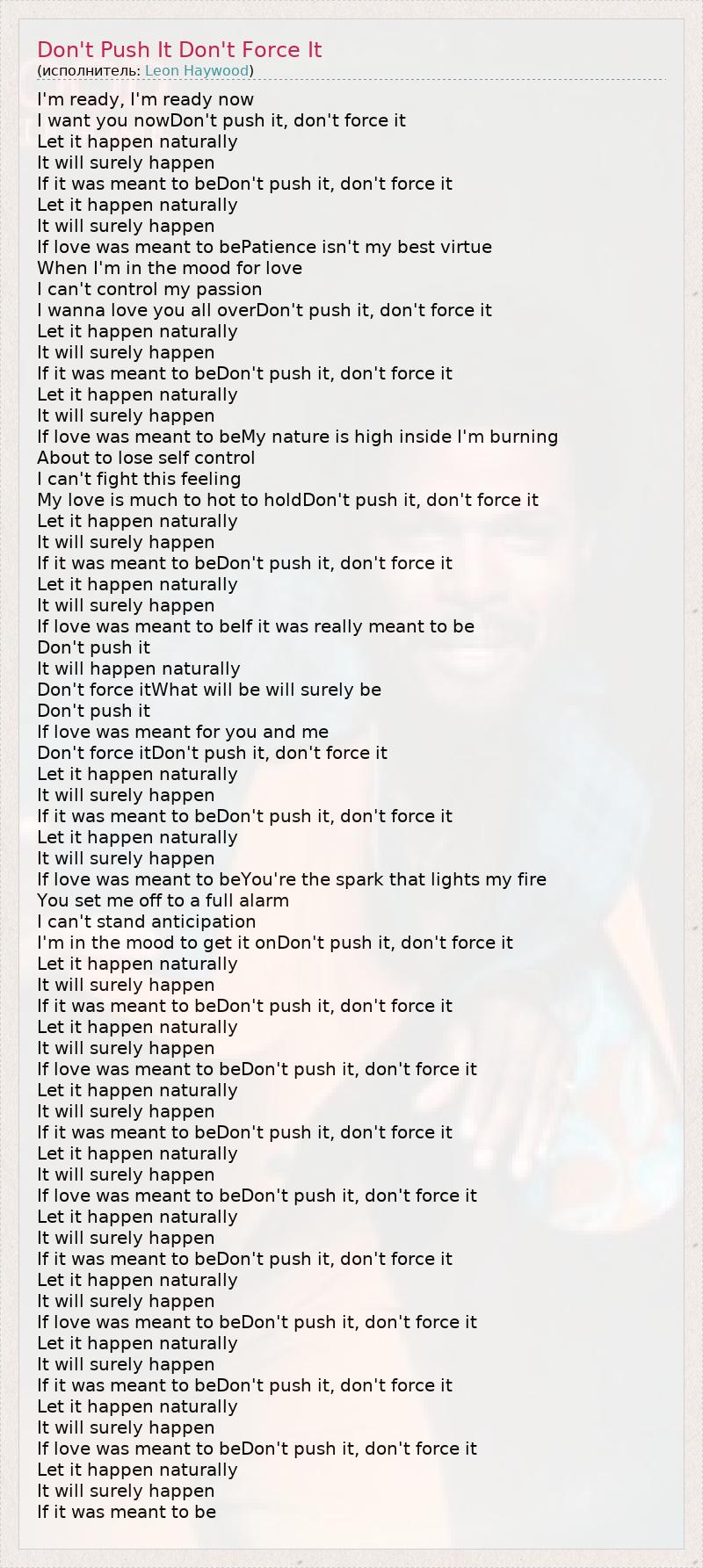 I'm ready, I'm ready now I want you nowDon't push it, don't force it Let it happen naturally It will surely happen If it was meant to beDon't push it, don't force it Let it happen naturally It will surely happen If love was meant to bePatience isn't my best virtue When I'm in the mood for love I can't control my passion I wanna love you all overDon't push it, don't force it Let it happen naturally It will surely happen If it was meant to beDon't push it, don't force it Let it happen naturally It will surely happen If love was meant to beMy nature is high inside I'm burning About to lose self control I can't fight this feeling My love is much to hot to holdDon't push it, don't force it Let it happen naturally It will surely happen If it was meant to beDon't push it, don't force it Let it happen naturally It will surely happen If love was meant to beIf it was really meant to be Don't push it It will happen naturally Don't force itWhat will be will surely be Don't push it If love was meant for you and me Don't force itDon't push it, don't force it Let it happen naturally It will surely happen If it was meant to beDon't push it, don't force it Let it happen naturally It will surely happen If love was meant to beYou're the spark that lights my fire You set me off to a full alarm I can't stand anticipation I'm in the mood to get it onDon't push it, don't force it Let it happen naturally It will surely happen If it was meant to beDon't push it, don't force it Let it happen naturally It will surely happen If love was meant to beDon't push it, don't force it Let it happen naturally It will surely happen If it was meant to beDon't push it, don't force it Let it happen naturally It will surely happen If love was meant to beDon't push it, don't force it Let it happen naturally It will surely happen If it was meant to beDon't push it, don't force it Let it happen naturally It will surely happen If love was meant to beDon't push it, don't force it Let it happen naturally It will surely happen If it was meant to beDon't push it, don't force it Let it happen naturally It will surely happen If love was meant to beDon't push it, don't force it Let it happen naturally It will surely happen If it was meant to be
