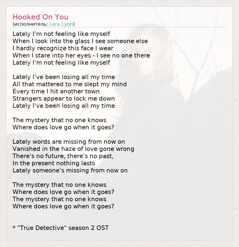 Lately I'm not feeling like myself When I look into the glass I see someone else I hardly recognize this face I wear When I stare into her eyes - I see no one there Lately I'm not feeling like myself Lately I've been losing all my time All that mattered to me slept my mind Every time I hit another town Strangers appear to lock me down Lately I've been losing all my time The mystery that no one knows Where does love go when it goes? Lately words are missing from now on Vanished in the haze of love gone wrong There's no future, there's no past, In the present nothing lasts Lately someone's missing from now on The mystery that no one knows Where does love go when it goes? The mystery that no one knows Where does love go when it goes? * "True Detective" season 2 OST