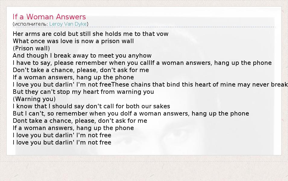 Her arms are cold but still she holds me to that vow What once was love is now a prison wall (Prison wall) And though I break away to meet you anyhow I have to say, please remember when you callIf a woman answers, hang up the phone Don't take a chance, please, don't ask for me If a woman answers, hang up the phone I love you but darlin' I'm not freeThese chains that bind this heart of mine may never break But they can't stop my heart from warning you (Warning you) I know that I should say don't call for both our sakes But I can't, so remember when you doIf a woman answers, hang up the phone Dont take a chance, please, don't ask for me If a woman answers, hang up the phone I love you but darlin' I'm not free I love you but darlin' I'm not free