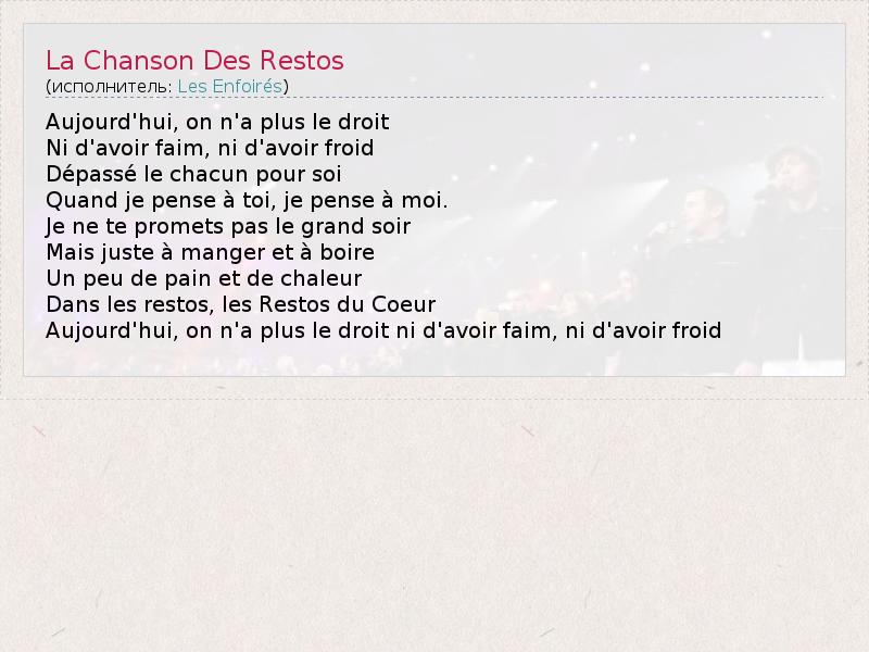 А как ты думаешь, о чем песня "La Chanson Des Restos" ?