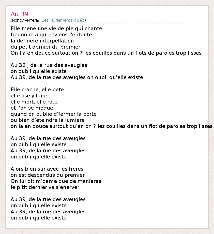 Elle mene une vie de pie qui chante fredonne a qui reviens l'entente la derniere interpellation du petit dernier du premier On l'a en douce surtout on ? les couilles dans un flots de paroles trop lisses Au 39 , de la rue des aveugles on oubli qu'elle existe Au 39, de la rue des aveugles on oubli qu'elle existe Elle crache, elle pete elle ose y faire elle mort, elle rote et l'on se moque quand on oublie d'fermer la porte ou bien d'eteindre la lumiere on la en douce surtout qu'en on ? les couilles dans un flot de paroles trop lisses Au 39, de la rue des aveugles on oubli qu'elle existe Au 39, de la rue des aveugles on oubli qu'elle existe Alors bien sur avec les freres on est descendus du premier On lui dit m'dame que de manieres le p'tit dernier va s'enerver Au 39, de la rue des aveugles on oubli qu'elle existe Au 39, de la rue des aveugles on oubli qu'elle existe