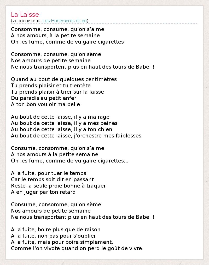 Consomme, consume, qu'on s'aime A nos amours, à la petite semaine On les fume, comme de vulgaire cigarettes Consomme, consume, qu'on sème Nos amours de petite semaine Ne nous transportent plus en haut des tours de Babel ! Quand au bout de quelques centimètres Tu prends plaisir et tu t'entête Tu prends plaisir à tirer sur la laisse Du paradis au petit enfer A ton bon vouloir ma belle Au bout de cette laisse, il y a ma rage Au bout de cette laisse, il y a mes peines Au bout de cette laisse, il y a ton chien Au bout de cette laisse, j'orchestre mes faiblesses Consume, consomme, qu'on s'aime A nos amours à la petite semaine On les fume, comme de vulgaire cigarettes... A la fuite, pour tuer le temps Car le temps soit dit en passant Reste la seule proie bonne à traquer A en juger par ton retard Consume, consomme, qu'on sème Nos amours de petite semaine Ne nous transportent plus en haut des tours de Babel ! A la fuite, boire plus que de raison A la fuite, non pas pour s'oublier A la fuite, mais pour boire simplement, Comme l'on vivote quand on perd le goût de vivre.