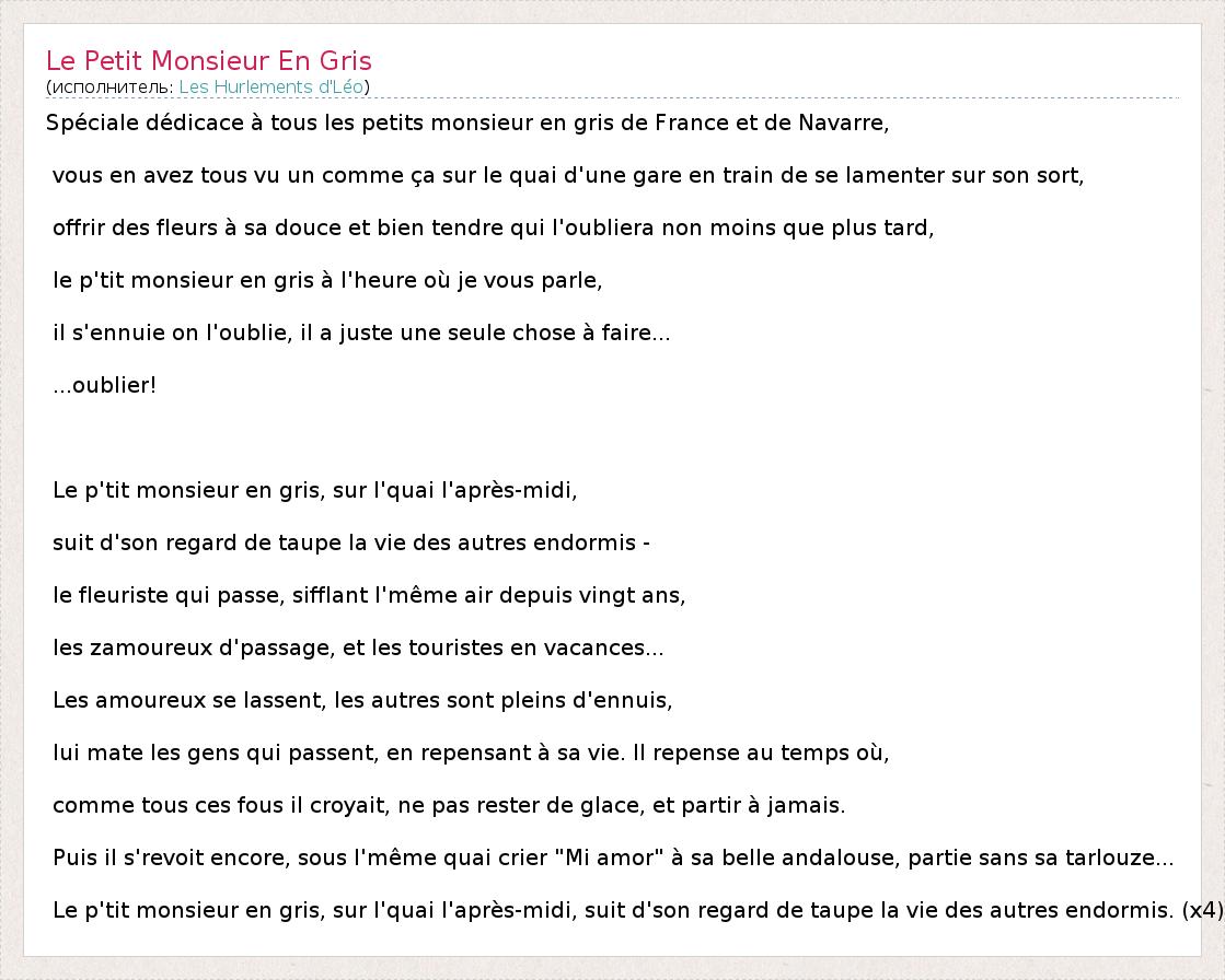 А как ты думаешь, о чем песня "Le Petit Monsieur En Gris" ?