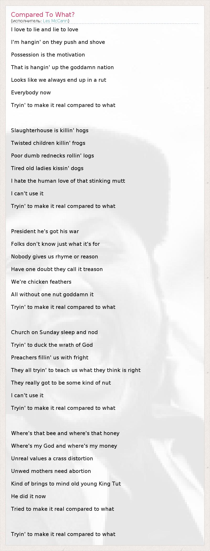 I love to lie and lie to love I'm hangin' on they push and shove Possession is the motivation That is hangin' up the goddamn nation Looks like we always end up in a rut Everybody now Tryin' to make it real compared to what Slaughterhouse is killin' hogs Twisted children killin' frogs Poor dumb rednecks rollin' logs Tired old ladies kissin' dogs I hate the human love of that stinking mutt I can't use it Tryin' to make it real compared to what President he's got his war Folks don't know just what it's for Nobody gives us rhyme or reason Have one doubt they call it treason We're chicken feathers All without one nut goddamn it Tryin' to make it real compared to what Church on Sunday sleep and nod Tryin' to duck the wrath of God Preachers fillin' us with fright They all tryin' to teach us what they think is right They really got to be some kind of nut I can't use it Tryin' to make it real compared to what Where's that bee and where's that honey Where's my God and where's my money Unreal values a crass distortion Unwed mothers need abortion Kind of brings to mind old young King Tut He did it now Tried to make it real compared to what Tryin' to make it real compared to what