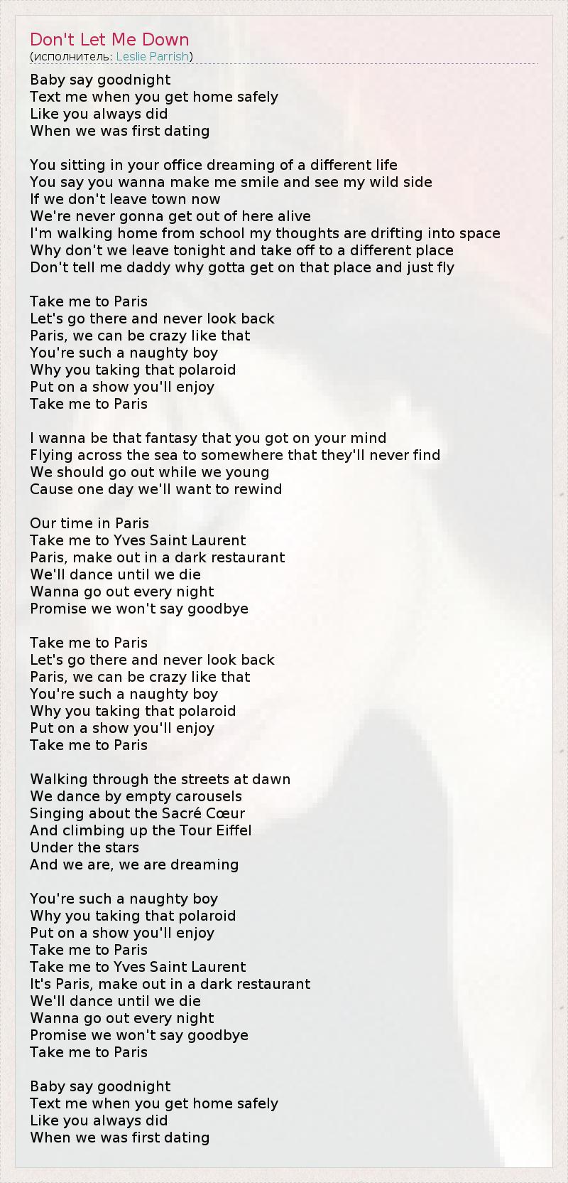 Любимый, пожелай мне спокойной ночи, Напиши мне, когда доберёшься домой, Как ты делал это с тех пор, Как мы начали встречаться. Ты сидишь в офисе, мечтая о жизни, говоришь, что хочешь Увидеть мою улыбку и мою необузданность. Но если мы сейчас же не уберёмся отсюда, То мы вряд ли будем живы. Я возвращаюсь домой из школы, а мысли витают в облаках: Почему бы нам сегодня не отправиться куда-нибудь? Не спрашивай меня ни о чём, просто давай улетим отсюда. Отвези меня в Париж! Полетим туда без оглядки назад! В Париж, ведь мы способны на такое безумство! Ты непослушный парень, Зачем ты взял с собой Polaroid? Готовься к шоу, тебе обязательно понравится. Отвези меня в Париж! Хочу быть той, о ком ты мечтаешь, Пока мы летим над океаном туда, где нас никто не найдёт. Мы должны наслаждаться жизнью, пока молоды, Ведь однажды нам захочется вспомнить... Это время в Париже. Своди меня в Дом моды Yves Saint Laurent! Париж, будем целоваться в тёмном ресторане, Танцевать, пока не надоест, Отрываться каждую ночь. Только обещай мне, что мы ни за что не расстанемся! Отвези меня в Париж! Полетим туда без оглядки назад! В Париж, ведь мы способны на такое безумство! Ты непослушный парень, Зачем ты взял с собой Polaroid? Готовься к шоу, тебе обязательно понравится. Отвези меня в Париж! Будем гулять по улицам до зари, Танцевать в пустых парках, 1 Петь о Соборе Сакре-Кёр, Поднимемся на Эйфелеву башню, Будем смотреть на звёзды И мечтать. Ты непослушный парень, Зачем ты взял с собой Polaroid? Готовься к шоу, тебе обязательно понравится, Отвези меня в Париж! Своди меня в Дом моды Yves Saint Laurent, Это Париж! Будем целоваться в тёмном ресторане, Танцевать, пока не надоест, Отрываться каждую ночь. Только обещай мне, что мы ни за что не расстанемся! Отвези меня в Париж... Любимый, пожелай мне спокойной ночи, Напиши мне, когда доберёшься домой, Как ты делал это с тех пор, Как мы начали встречаться... 1 - дословно: у пустых каруселей
