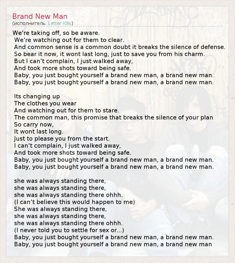We're taking off, so be aware. We're watching out for them to clear. And common sense is a common doubt it breaks the silence of defense. So bear it now, it wont last long, just to save you from his charm. But I can't complain, I just walked away, And took more shots toward being safe. Baby, you just bought yourself a brand new man, a brand new man. Baby, you just bought yourself a brand new man, a brand new man. Its changing up The clothes you wear And watching out for them to stare. The common man, this promise that breaks the silence of your plan So carry now, It wont last long. Just to please you from the start. I can't complain, I just walked away, And took more shots toward being safe. Baby, you just bought yourself a brand new man, a brand new man. Baby, you just bought yourself a brand new man, a brand new man. she was always standing there, she was always standing there, she was always standing there ohhh. (I can't believe this would happen to me) She was always standing there, she was always standing there, she was always standing there ohhh. (I never told you to settle for sex or...) Baby, you just bought yourself a brand new man, a brand new man. Baby, you just bought yourself a brand new man, a brand new man