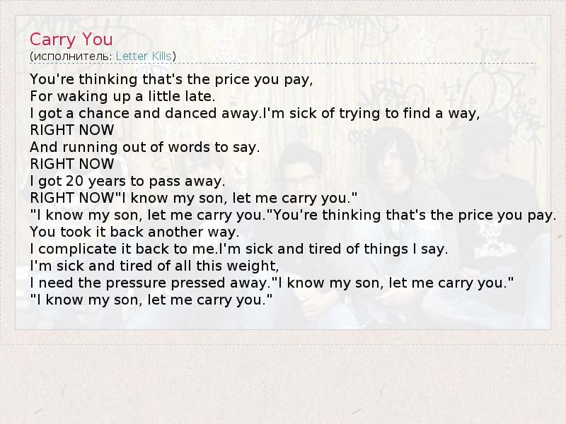 You're thinking that's the price you pay, For waking up a little late. I got a chance and danced away.I'm sick of trying to find a way, RIGHT NOW And running out of words to say. RIGHT NOW I got 20 years to pass away. RIGHT NOW"I know my son, let me carry you." "I know my son, let me carry you."You're thinking that's the price you pay. You took it back another way. I complicate it back to me.I'm sick and tired of things I say. I'm sick and tired of all this weight, I need the pressure pressed away."I know my son, let me carry you." "I know my son, let me carry you."