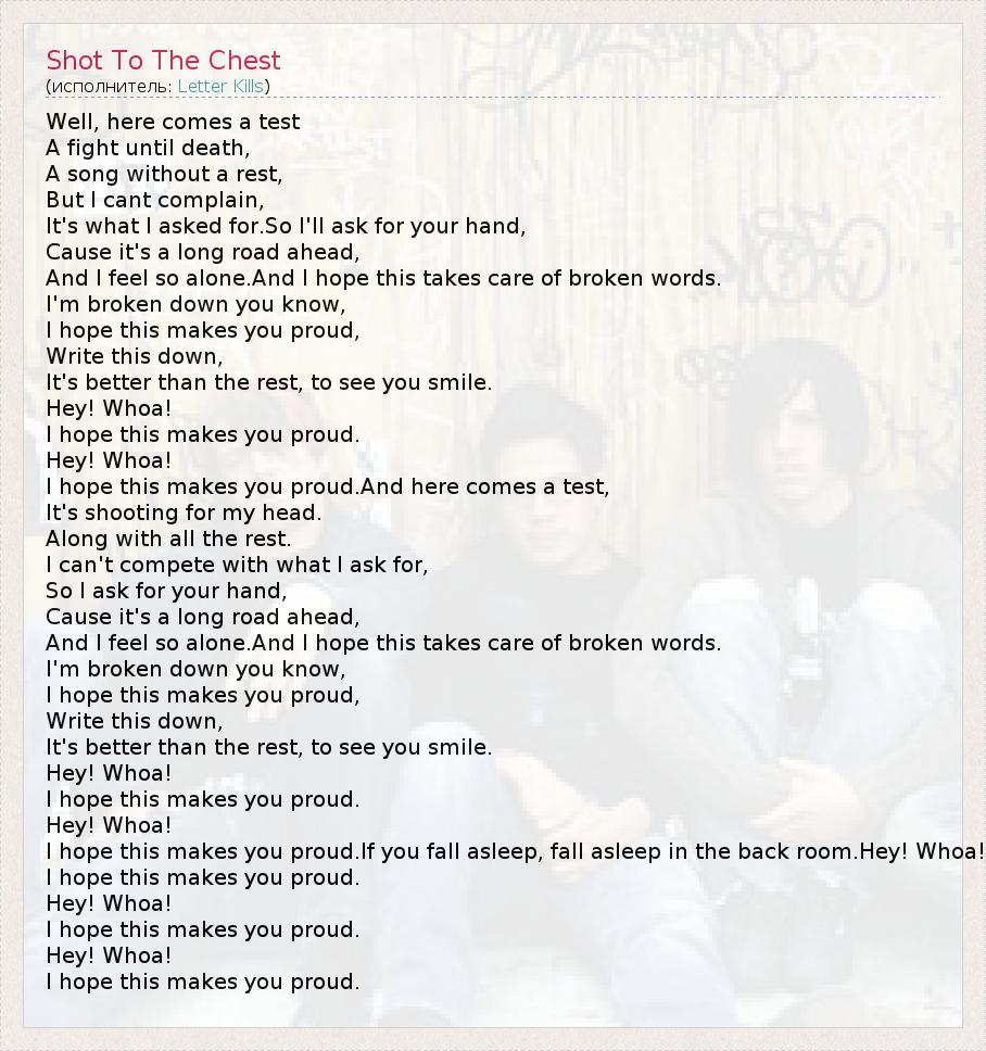 Well, here comes a test A fight until death, A song without a rest, But I cant complain, It's what I asked for.So I'll ask for your hand, Cause it's a long road ahead, And I feel so alone.And I hope this takes care of broken words. I'm broken down you know, I hope this makes you proud, Write this down, It's better than the rest, to see you smile. Hey! Whoa! I hope this makes you proud. Hey! Whoa! I hope this makes you proud.And here comes a test, It's shooting for my head. Along with all the rest. I can't compete with what I ask for, So I ask for your hand, Cause it's a long road ahead, And I feel so alone.And I hope this takes care of broken words. I'm broken down you know, I hope this makes you proud, Write this down, It's better than the rest, to see you smile. Hey! Whoa! I hope this makes you proud. Hey! Whoa! I hope this makes you proud.If you fall asleep, fall asleep in the back room.Hey! Whoa! I hope this makes you proud. Hey! Whoa! I hope this makes you proud. Hey! Whoa! I hope this makes you proud.