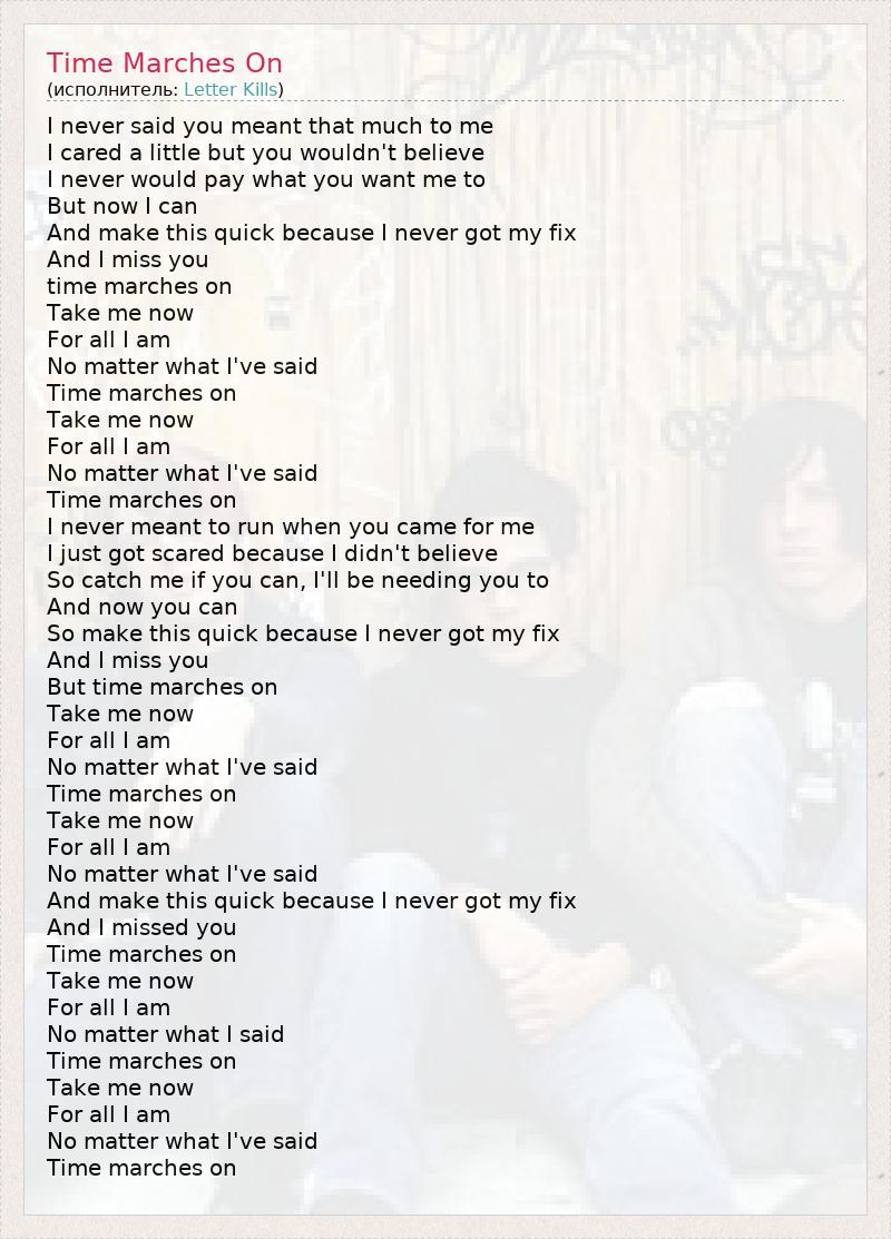 I never said you meant that much to me I cared a little but you wouldn't believe I never would pay what you want me to But now I can And make this quick because I never got my fix And I miss you time marches on Take me now For all I am No matter what I've said Time marches on Take me now For all I am No matter what I've said Time marches on I never meant to run when you came for me I just got scared because I didn't believe So catch me if you can, I'll be needing you to And now you can So make this quick because I never got my fix And I miss you But time marches on Take me now For all I am No matter what I've said Time marches on Take me now For all I am No matter what I've said And make this quick because I never got my fix And I missed you Time marches on Take me now For all I am No matter what I said Time marches on Take me now For all I am No matter what I've said Time marches on
