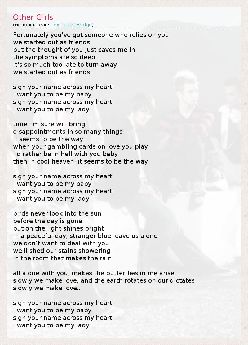 Fortunately you've got someone who relies on you we started out as friends but the thought of you just caves me in the symptoms are so deep it's so much too late to turn away we started out as friends sign your name across my heart i want you to be my baby sign your name across my heart i want you to be my lady time i'm sure will bring disappointments in so many things it seems to be the way when your gambling cards on love you play i'd rather be in hell with you baby then in cool heaven, it seems to be the way sign your name across my heart i want you to be my baby sign your name across my heart i want you to be my lady birds never look into the sun before the day is gone but oh the light shines bright in a peaceful day, stranger blue leave us alone we don't want to deal with you we'll shed our stains showering in the room that makes the rain all alone with you, makes the butterflies in me arise slowly we make love, and the earth rotates on our dictates slowly we make love.. sign your name across my heart i want you to be my baby sign your name across my heart i want you to be my lady