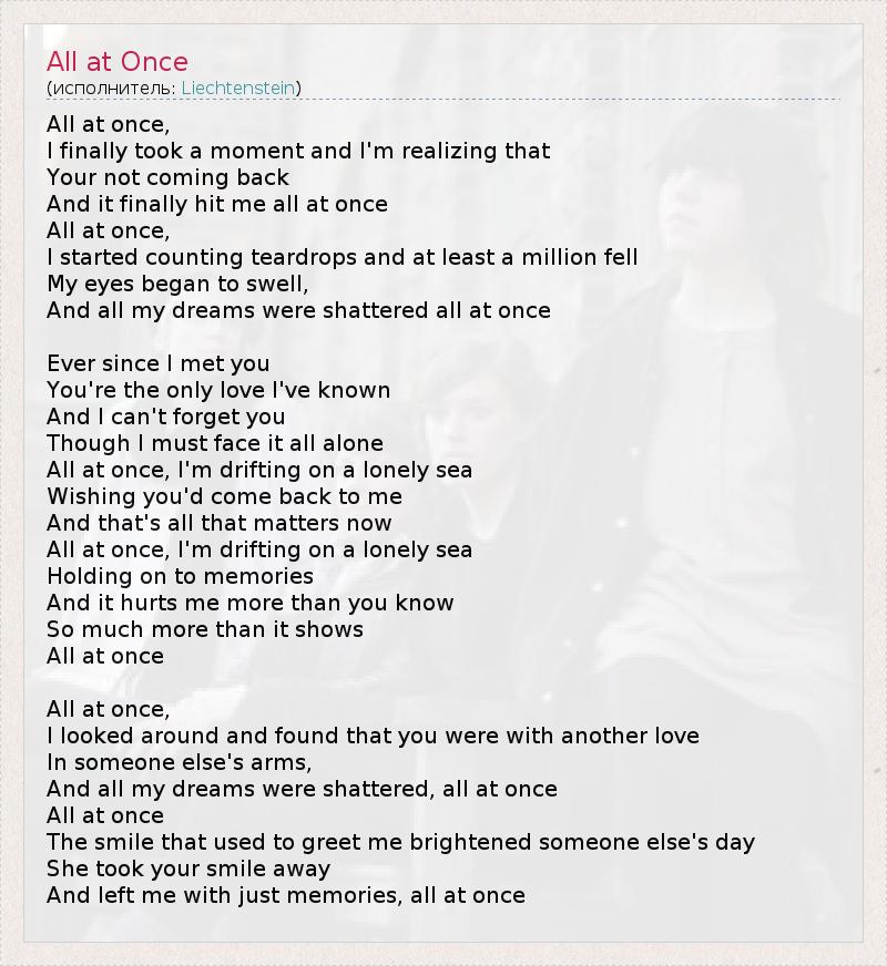 All at once, I finally took a moment and I'm realizing that Your not coming back And it finally hit me all at once All at once, I started counting teardrops and at least a million fell My eyes began to swell, And all my dreams were shattered all at once Ever since I met you You're the only love I've known And I can't forget you Though I must face it all alone All at once, I'm drifting on a lonely seа Wishing you'd come back to me And that's all that matters now All at once, I'm drifting on a lonely sea Holding on to memories And it hurts me more than you know So much more than it shows All at once All at once, I looked around and found that you were with another love In someone else's arms, And all my dreams were shattered, all at once All at once The smile that used to greet me brightened someone else's day She took your smile away And left me with just memories, all at once