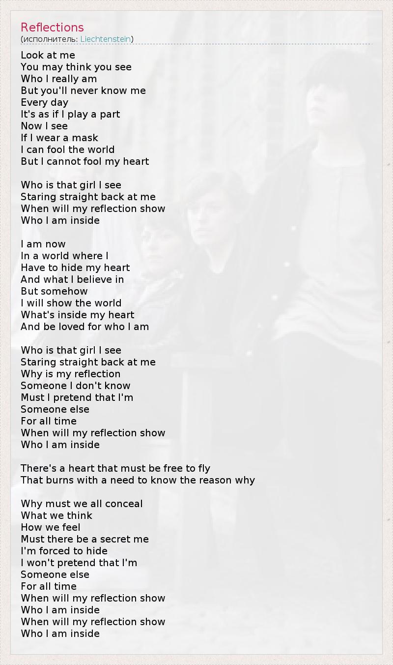 Посмотри на меня ты можешь думать,что видишь меня настоящую но ты никогда не узнаешь меня каждый день это часть моей игры сейчас я вижу,что если ношу маску то я могу обманывать мир,но я не могу обманывать свое сердце Кто та девочка,стоящая прямо за моей спиной, когда мое отражение покажет кто я внутри Я сейчас в мире,где должна прятать свое сердце и верю в то,что как-нибудь я покажу миру,что находится у меня в сердце и люблю то кем я являюсь Кто та девочка,стоящая прямо за моей спиной почему в моем отражении кто-то кого я не знала может я притворялась кем-то другим все это время когда мое отражение покажет кто я внутри Там сердце,котрое должно быть свободно к полету которое горит от необходимости знать причину почему почему мы все должны скрывать то,что думаем что чувствуем должна быть секретность я вынуждена прятаться Я притворялась,что я кто-то другой все это время когда мое отражение покажет кто я внутри когда мое отражение покажет кто я внутри