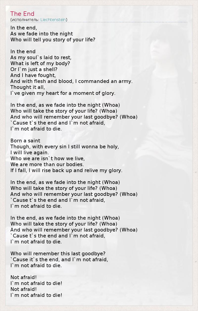 In the end, As we fade into the night Who will tell you story of your life? In the end As my soul`s laid to rest, What is left of my body? Or I`m just a shell? And I have fought, And with flesh and blood, I commanded an army. Thought it all, I`ve given my heart for a moment of glory. In the end, as we fade into the night (Whoa) Who will take the story of your life? (Whoa) And who will remember your last goodbye? (Whoa) `Cause t`s the end and I`m not afraid, I`m not afraid to die. Born a saint Though, with every sin I still wonna be holy, I will live again. Who we are isn`t how we live, We are more than our bodies. If I fall, I will rise back up and relive my glory. In the end, as we fade into the night (Whoa) Who will take the story of your life? (Whoa) And who will remember your last goodbye? (Whoa) `Cause t`s the end and I`m not afraid, I`m not afraid to die. In the end, as we fade into the night (Whoa) Who will take the story of your life? (Whoa) And who will remember your last goodbye? (Whoa) `Cause t`s the end and I`m not afraid, I`m not afraid to die. Who will remember this last goodbye? `Cause it`s the end, and I`m not afraid, I`m not afraid to die. Not afraid! I`m not afraid to die! Not afraid! I`m not afraid to die!