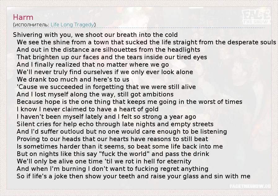 Это интересно:Life Long Tragedy - пятеро парней из Сан-Франциско, Калифория, играющие довольно медленный и слегка мрачноватый, но несмотря на это мелодичный и просто красивый хардкор. Образовалась группа в далёком 2001 году, когда вокалист Скотт Филипс, гитарист RJ Филипс и драммер Джейсон Вулери (которым было тогда всего лишь 14-16 лет) решили найти себя в музыке. Менее чем через полгода гитарист Джерри Гальегос... продолжение