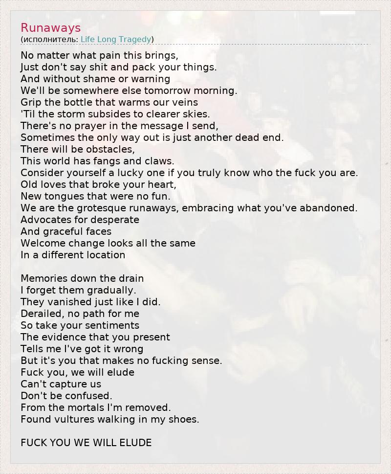 Это интересно:Life Long Tragedy - пятеро парней из Сан-Франциско, Калифория, играющие довольно медленный и слегка мрачноватый, но несмотря на это мелодичный и просто красивый хардкор. Образовалась группа в далёком 2001 году, когда вокалист Скотт Филипс, гитарист RJ Филипс и драммер Джейсон Вулери (которым было тогда всего лишь 14-16 лет) решили найти себя в музыке. Менее чем через полгода гитарист Джерри Гальегос... продолжение