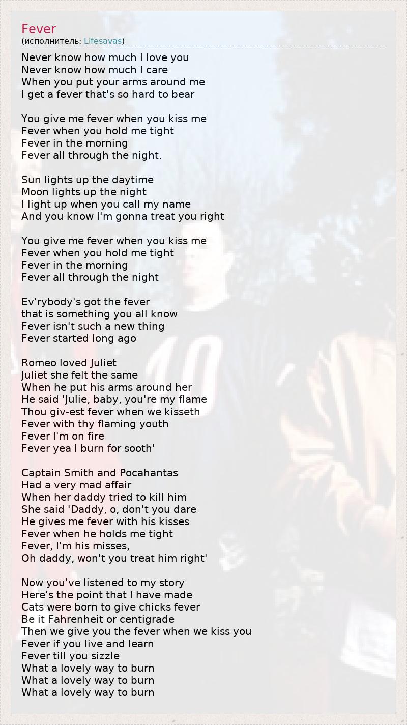 Never know how much I love you Never know how much I care When you put your arms around me I get a fever that's so hard to bear You give me fever when you kiss me Fever when you hold me tight Fever in the morning Fever all through the night. Sun lights up the daytime Moon lights up the night I light up when you call my name And you know I'm gonna treat you right You give me fever when you kiss me Fever when you hold me tight Fever in the morning Fever all through the night Ev'rybody's got the fever that is something you all know Fever isn't such a new thing Fever started long ago Romeo loved Juliet Juliet she felt the same When he put his arms around her He said 'Julie, baby, you're my flame Thou giv-est fever when we kisseth Fever with thy flaming youth Fever I'm on fire Fever yea I burn for sooth' Captain Smith and Pocahantas Had a very mad affair When her daddy tried to kill him She said 'Daddy, o, don't you dare He gives me fever with his kisses Fever when he holds me tight Fever, I'm his misses, Oh daddy, won't you treat him right' Now you've listened to my story Here's the point that I have made Cats were born to give chicks fever Be it Fahrenheit or centigrade Then we give you the fever when we kiss you Fever if you live and learn Fever till you sizzle What a lovely way to burn What a lovely way to burn What a lovely way to burn