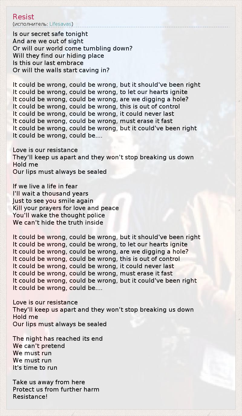 Не раскроют ли наш секрет этой ночью? И действительно ли мы вне поля зрения? Или же нашему миру придет конец? Найдут ли они наше убежище? Может, это наше последние объятие? Или же стены начнут рушиться? Это могло, могло быть неправильно, но лучше было бы наоборот. Это могло, могло быть неправильно, позволить нашим сердцам зажечься. Это могло, могло быть неправильно, мы роем себе яму? Это могло, могло быть неправильно, это неподвластно нашему контролю. Это могло, могло быть неправильно, это не продлилось бы долго. Это могло, могло быть неправильно, необходимо быстро стереть это. Это могло, могло быть неправильно, а могло быть и наоборот... Это могло, могло быть неправильно... Любовь - вот наше сопротивление! Они будут держать нас порознь и не прекратят ломать нас. Держи меня! Наши губы должны всегда быть сомкнуты. Живя в страхе, Я буду ждать тысячу лет, Просто чтобы увидеть твою улыбку. Прекрати молиться ради любви и мира: Ты разбудишь стражей мысли, И мы не сможем спрятать правду внутри себя. Это могло, могло быть неправильно, но лучше было бы наоборот. Это могло, могло быть неправильно, позволить нашим сердцам зажечься. Это могло, могло быть неправильно, мы роем себе яму? Это могло, могло быть неправильно, это неподвластно нашему контролю. Это могло, могло быть неправильно, это не продлилось бы долго. Это могло, могло быть неправильно, необходимо быстро стереть это. Это могло, могло быть неправильно, а могло быть и наоборот... Это могло, могло быть неправильно... Любовь - вот наше сопротивление! Они будут держать нас порознь и не прекратят ломать нас. Держи меня! Наши губы должны всегда быть сомкнуты. Ночь кончается. Мы не можем притворяться, Мы должны бежать, Мы должны бежать. Время бежать! Забери нас подальше отсюда! Защити нас от дальнейших страданий! Сопротивляйся!