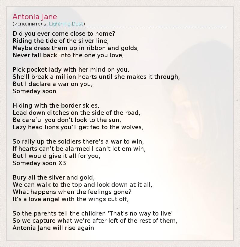 Did you ever come close to home? Riding the tide of the silver line, Maybe dress them up in ribbon and golds, Never fall back into the one you love, Pick pocket lady with her mind on you, She'll break a million hearts until she makes it through, But I declare a war on you, Someday soon Hiding with the border skies, Lead down ditches on the side of the road, Be careful you don't look to the sun, Lazy head lions you'll get fed to the wolves, So rally up the soldiers there's a war to win, If hearts can't be alarmed I can't let em win, But I would give it all for you, Someday soon X3 Bury all the silver and gold, We can walk to the top and look down at it all, What happens when the feelings gone? It's a love angel with the wings cut off, So the parents tell the children 'That's no way to live' So we capture what we're after left of the rest of them, Antonia Jane will rise again