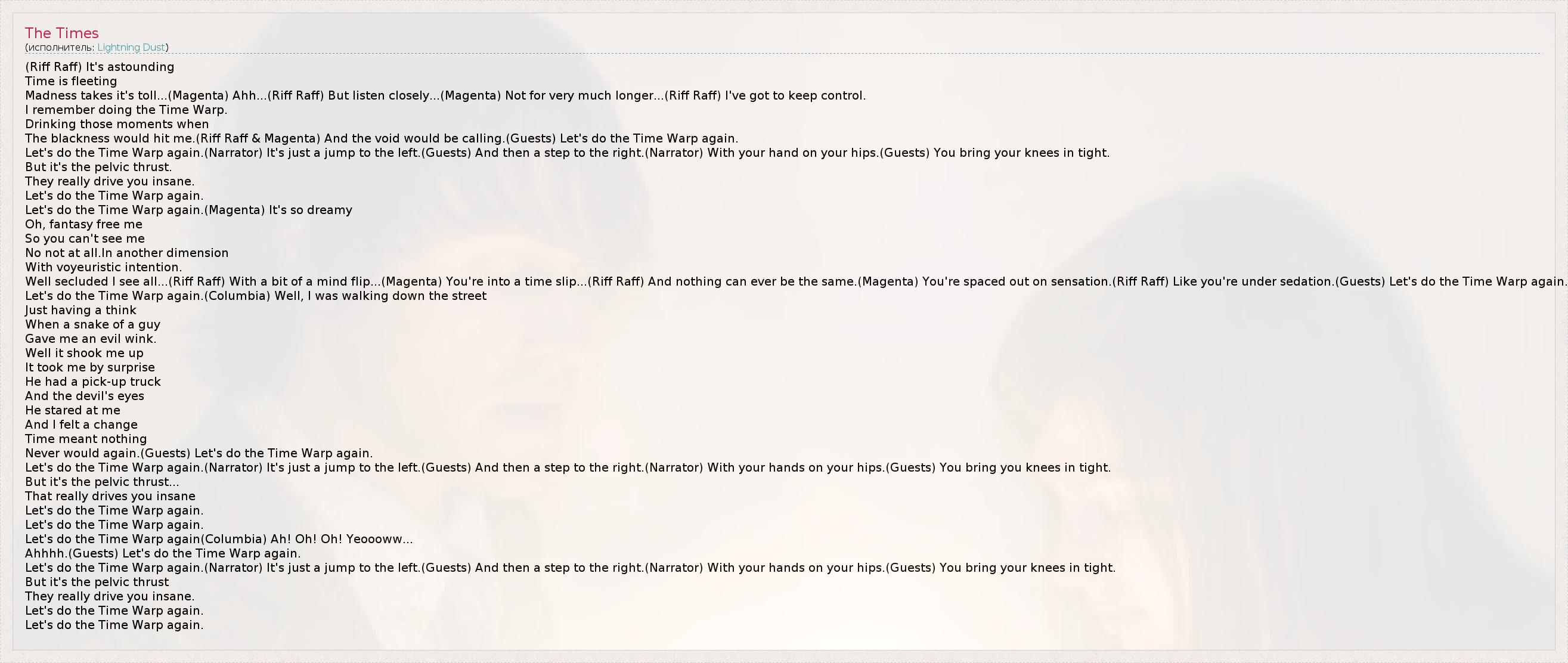 Never would again.(Guests) Let's do the Time Warp again.