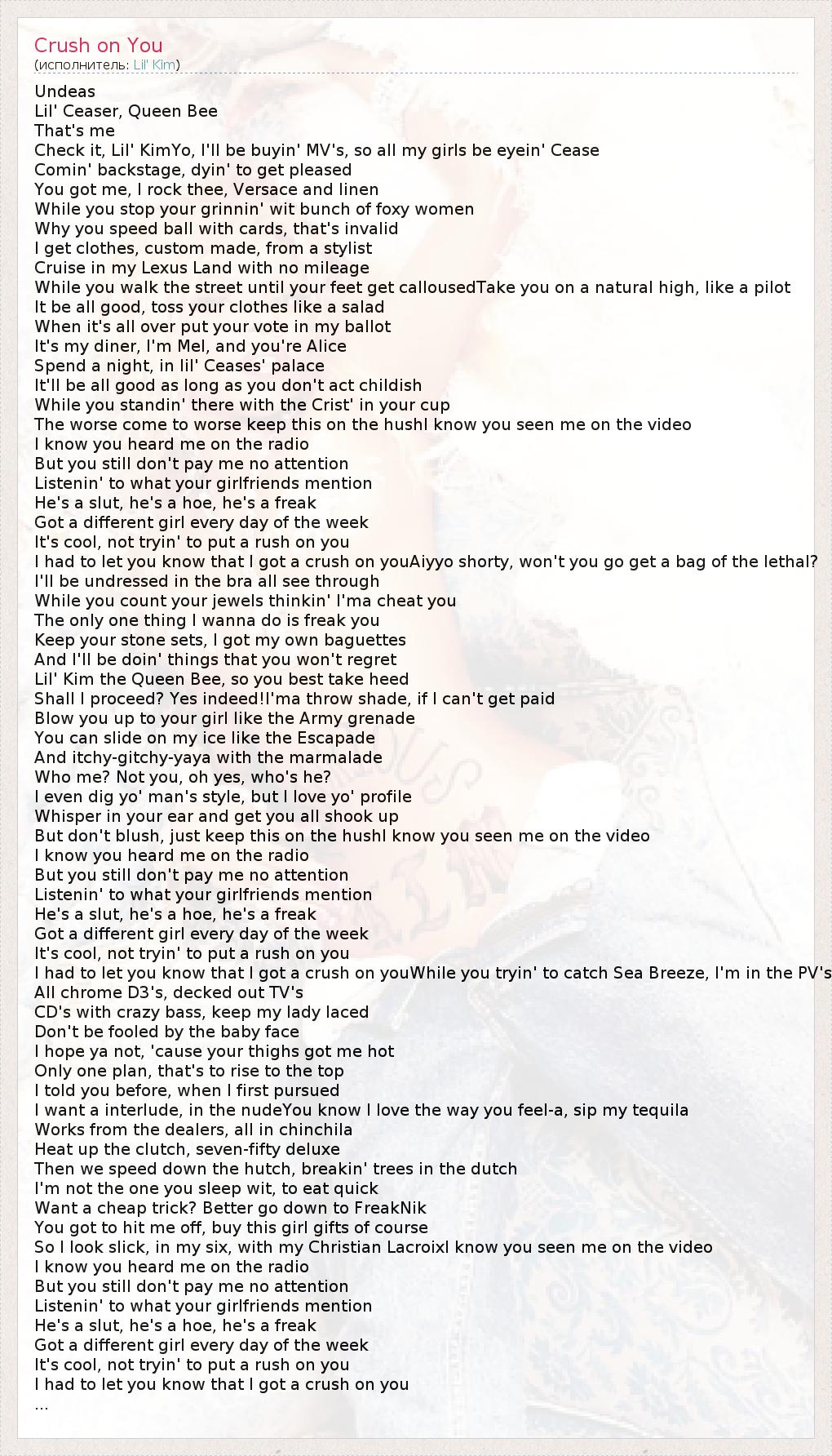 Это интересно:Имя: Kimberly Denise Jones.Псевдоним: Lil' Kim.Дата и место рождения: 11 июля 1975 года, Бруклин, Нью-Йорк.После развода родителей, когда Ким было 9 лет, она стала жить с отцом. Изначально Ким и ее старший брат Кристофер, жили с матерью, до тех пор, пока опека над детьми не была передана её отцу. Ким была непослушным ребёнком, но ей приходилось жить по строгим правила её отца, из-за чего, они постоянно... продолжение