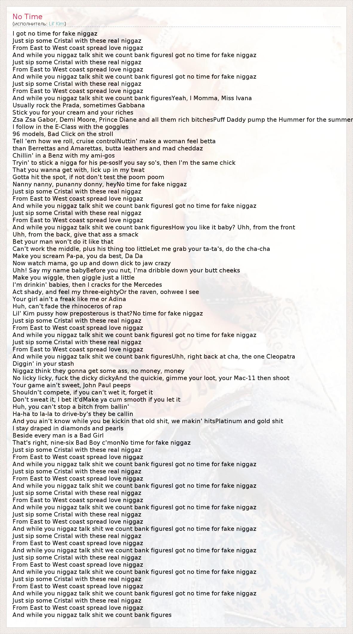 I got no time for fake niggaz Just sip some Cristal with these real niggaz From East to West coast spread love niggaz And while you niggaz talk shit we count bank figuresI got no time for fake niggaz Just sip some Cristal with these real niggaz From East to West coast spread love niggaz And while you niggaz talk shit we count bank figuresI got no time for fake niggaz Just sip some Cristal with these real niggaz From East to West coast spread love niggaz And while you niggaz talk shit we count bank figuresYeah, I Momma, Miss Ivana Usually rock the Prada, sometimes Gabbana Stick you for your cream and your riches Zsa Zsa Gabor, Demi Moore, Prince Diane and all them rich bitchesPuff Daddy pump the Hummer for the summer I follow in the E-Class with the goggles 96 models, Bad Click on the stroll Tell 'em how we roll, cruise controlNuttin' make a woman feel betta than Berrettas and Amarettas, butta leathers and mad cheddaz Chillin' in a Benz with my ami-gos Tryin' to stick a nigga for his pe-sosIf you say so's, then I'm the same chick That you wanna get with, lick up in my twat Gotta hit the spot, if not don't test the poom poom Nanny nanny, punanny donny, heyNo time for fake niggaz Just sip some Cristal with these real niggaz From East to West coast spread love niggaz And while you niggaz talk shit we count bank figuresI got no time for fake niggaz Just sip some Cristal with these real niggaz From East to West coast spread love niggaz And while you niggaz talk shit we count bank figuresHow you like it baby? Uhh, from the front Uhh, from the back, give that ass a smack Bet your man won't do it like that Can't work the middle, plus his thing too littleLet me grab your ta-ta's, do the cha-cha Make you scream Pa-pa, you da best, Da Da Now watch mama, go up and down dick to jaw crazy Uhh! Say my name babyBefore you nut, I'ma dribble down your butt cheeks Make you wiggle, then giggle just a little I'm drinkin' babies, then I cracks for the Mercedes Act shady, and feel my three-eightyOr the raven, oohwee I see Your girl ain't a freak like me or Adina Huh, can't fade the rhinoceros of rap Lil' Kim pussy how preposterous is that?No time for fake niggaz Just sip some Cristal with these real niggaz From East to West coast spread love niggaz And while you niggaz talk shit we count bank figuresI got no time for fake niggaz Just sip some Cristal with these real niggaz From East to West coast spread love niggaz And while you niggaz talk shit we count bank figuresUhh, right back at cha, the one Cleopatra Diggin' in your stash Niggaz think they gonna get some ass, no money, money No licky licky, fuck the dicky dickyAnd the quickie, gimme your loot, your Mac-11 then shoot Your game ain't sweet, John Paul peeps Shouldn't compete, if you can't wet it, forget it Don't sweat it, I bet it'dMake ya cum smooth if you let it Huh, you can't stop a bitch from ballin' Ha-ha to la-la to drive-by's they be callin And you ain't know while you be kickin that old shit, we makin' hitsPlatinum and gold shit I stay draped in diamonds and pearls Beside every man is a Bad Girl That's right, nine-six Bad Boy c'monNo time for fake niggaz Just sip some Cristal with these real niggaz From East to West coast spread love niggaz And while you niggaz talk shit we count bank figuresI got no time for fake niggaz Just sip some Cristal with these real niggaz From East to West coast spread love niggaz And while you niggaz talk shit we count bank figuresI got no time for fake niggaz Just sip some Cristal with these real niggaz From East to West coast spread love niggaz And while you niggaz talk shit we count bank figuresI got no time for fake niggaz Just sip some Cristal with these real niggaz From East to West coast spread love niggaz And while you niggaz talk shit we count bank figuresI got no time for fake niggaz Just sip some Cristal with these real niggaz From East to West coast spread love niggaz And while you niggaz talk shit we count bank figuresI got no time for fake niggaz Just sip some Cristal with these real niggaz From East to West coast spread love niggaz And while you niggaz talk shit we count bank figuresI got no time for fake niggaz Just sip some Cristal with these real niggaz From East to West coast spread love niggaz And while you niggaz talk shit we count bank figuresI got no time for fake niggaz Just sip some Cristal with these real niggaz From East to West coast spread love niggaz And while you niggaz talk shit we count bank figures