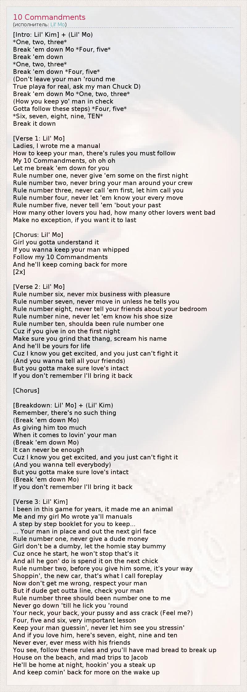 [Intro: Lil' Kim] + (Lil' Mo) *One, two, three* Break 'em down Mo *Four, five* Break 'em down *One, two, three* Break 'em down *Four, five* (Don't leave your man 'round me True playa for real, ask my man Chuck D) Break 'em down Mo *One, two, three* (How you keep yo' man in check Gotta follow these steps) *Four, five* *Six, seven, eight, nine, TEN* Break it down [Verse 1: Lil' Mo] Ladies, I wrote me a manual How to keep your man, there's rules you must follow My 10 Commandments, oh oh oh Let me break 'em down for you Rule number one, never give 'em some on the first night Rule number two, never bring your man around your crew Rule number three, never call 'em first, let him call you Rule number four, never let 'em know your every move Rule number five, never tell 'em 'bout your past How many other lovers you had, how many other lovers went bad Make no exception, if you want it to last [Chorus: Lil' Mo] Girl you gotta understand it If you wanna keep your man whipped Follow my 10 Commandments And he'll keep coming back for more [2x] [Verse 2: Lil' Mo] Rule number six, never mix business with pleasure Rule number seven, never move in unless he tells you Rule number eight, never tell your friends about your bedroom Rule number nine, never let 'em know his shoe size Rule number ten, shoulda been rule number one Cuz if you give in on the first night Make sure you grind that thang, scream his name And he'll be yours for life Cuz I know you get excited, and you just can't fight it (And you wanna tell all your friends) But you gotta make sure love's intact If you don't remember I'll bring it back [Chorus] [Breakdown: Lil' Mo] + (Lil' Kim) Remember, there's no such thing (Break 'em down Mo) As giving him too much When it comes to lovin' your man (Break 'em down Mo) It can never be enough Cuz I know you get excited, and you just can't fight it (And you wanna tell everybody) But you gotta make sure love's intact (Break 'em down Mo) If you don't remember I'll bring it back [Verse 3: Lil' Kim] I been in this game for years, it made me an animal Me and my girl Mo wrote ya'll manuals A step by step booklet for you to keep... ... Your man in place and out the next girl face Rule number one, never give a dude money Girl don't be a dumby, let the homie stay bummy Cuz once he start, he won't stop that's it And all he gon' do is spend it on the next chick Rule number two, before you give him some, it's your way Shoppin', the new car, that's what I call foreplay Now don't get me wrong, respect your man But if dude get outta line, check your man Rule number three should been number one to me Never go down 'till he lick you 'round Your neck, your back, your pussy and ass crack (Feel me?) Four, five and six, very important lesson Keep your man guessin', never let him see you stressin' And if you love him, here's seven, eight, nine and ten Never ever, ever mess with his friends You see, follow these rules and you'll have mad bread to break up House on the beach, and mad trips to Jacob He'll be home at night, hookin' you a steak up And keep comin' back for more on the wake up