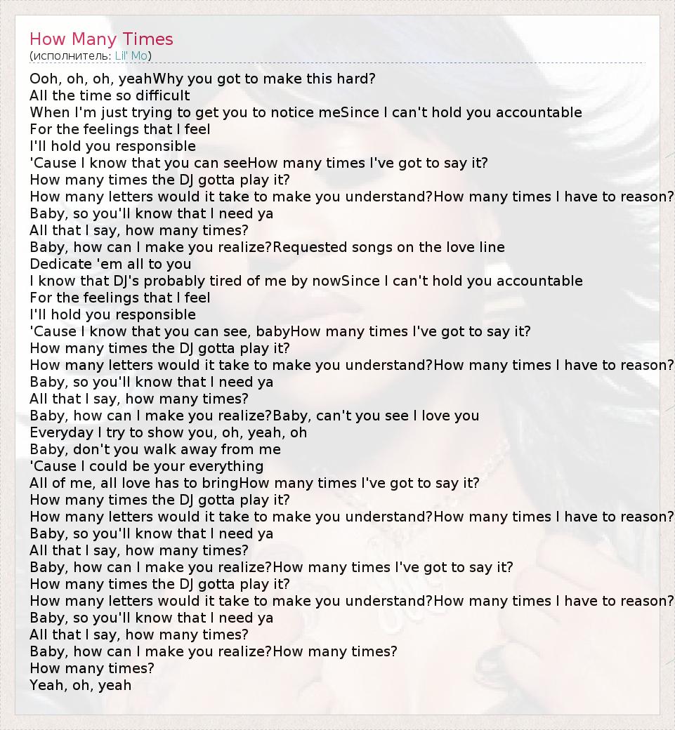 Ooh, oh, oh, yeahWhy you got to make this hard? All the time so difficult When I'm just trying to get you to notice meSince I can't hold you accountable For the feelings that I feel I'll hold you responsible 'Cause I know that you can seeHow many times I've got to say it? How many times the DJ gotta play it? How many letters would it take to make you understand?How many times I have to reason? Baby, so you'll know that I need ya All that I say, how many times? Baby, how can I make you realize?Requested songs on the love line Dedicate 'em all to you I know that DJ's probably tired of me by nowSince I can't hold you accountable For the feelings that I feel I'll hold you responsible 'Cause I know that you can see, babyHow many times I've got to say it? How many times the DJ gotta play it? How many letters would it take to make you understand?How many times I have to reason? Baby, so you'll know that I need ya All that I say, how many times? Baby, how can I make you realize?Baby, can't you see I love you Everyday I try to show you, oh, yeah, oh Baby, don't you walk away from me 'Cause I could be your everything All of me, all love has to bringHow many times I've got to say it? How many times the DJ gotta play it? How many letters would it take to make you understand?How many times I have to reason? Baby, so you'll know that I need ya All that I say, how many times? Baby, how can I make you realize?How many times I've got to say it? How many times the DJ gotta play it? How many letters would it take to make you understand?How many times I have to reason? Baby, so you'll know that I need ya All that I say, how many times? Baby, how can I make you realize?How many times? How many times? Yeah, oh, yeah