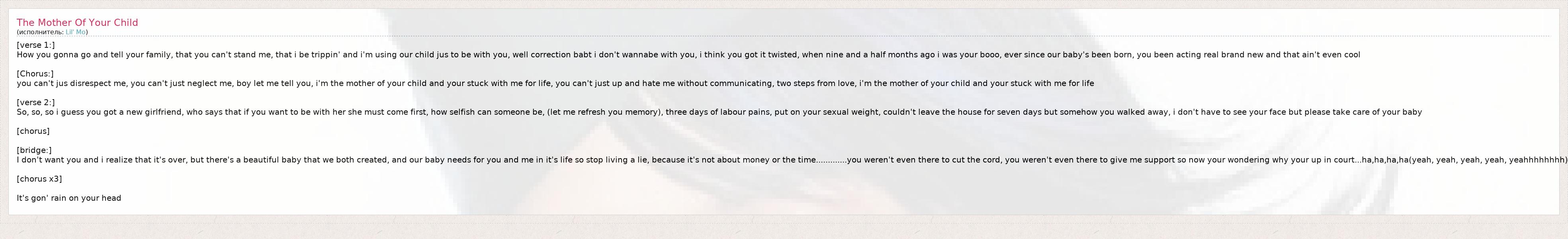 [verse 1:] How you gonna go and tell your family, that you can't stand me, that i be trippin' and i'm using our child jus to be with you, well correction babt i don't wannabe with you, i think you got it twisted, when nine and a half months ago i was your booo, ever since our baby's been born, you been acting real brand new and that ain't even cool [Chorus:] you can't jus disrespect me, you can't just neglect me, boy let me tell you, i'm the mother of your child and your stuck with me for life, you can't just up and hate me without communicating, two steps from love, i'm the mother of your child and your stuck with me for life [verse 2:] So, so, so i guess you got a new girlfriend, who says that if you want to be with her she must come first, how selfish can someone be, (let me refresh you memory), three days of labour pains, put on your sexual weight, couldn't leave the house for seven days but somehow you walked away, i don't have to see your face but please take care of your baby [chorus] [bridge:] I don't want you and i realize that it's over, but there's a beautiful baby that we both created, and our baby needs for you and me in it's life so stop living a lie, because it's not about money or the time.............you weren't even there to cut the cord, you weren't even there to give me support so now your wondering why your up in court...ha,ha,ha,ha(yeah, yeah, yeah, yeah, yeahhhhhhhh) [chorus x3] It's gon' rain on your head