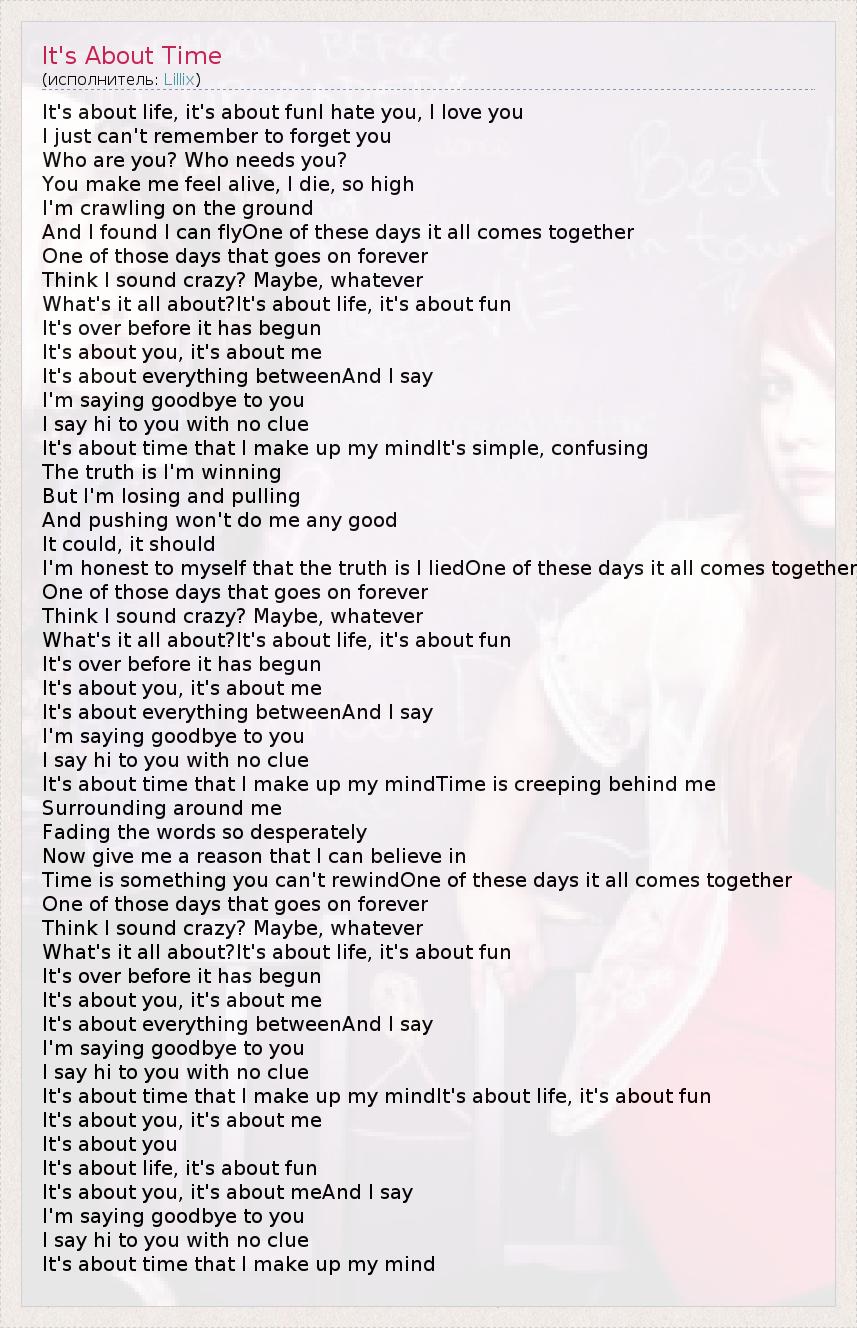 It's about life, it's about funI hate you, I love you I just can't remember to forget you Who are you? Who needs you? You make me feel alive, I die, so high I'm crawling on the ground And I found I can flyOne of these days it all comes together One of those days that goes on forever Think I sound crazy? Maybe, whatever What's it all about?It's about life, it's about fun It's over before it has begun It's about you, it's about me It's about everything betweenAnd I say I'm saying goodbye to you I say hi to you with no clue It's about time that I make up my mindIt's simple, confusing The truth is I'm winning But I'm losing and pulling And pushing won't do me any good It could, it should I'm honest to myself that the truth is I liedOne of these days it all comes together One of those days that goes on forever Think I sound crazy? Maybe, whatever What's it all about?It's about life, it's about fun It's over before it has begun It's about you, it's about me It's about everything betweenAnd I say I'm saying goodbye to you I say hi to you with no clue It's about time that I make up my mindTime is creeping behind me Surrounding around me Fading the words so desperately Now give me a reason that I can believe in Time is something you can't rewindOne of these days it all comes together One of those days that goes on forever Think I sound crazy? Maybe, whatever What's it all about?It's about life, it's about fun It's over before it has begun It's about you, it's about me It's about everything betweenAnd I say I'm saying goodbye to you I say hi to you with no clue It's about time that I make up my mindIt's about life, it's about fun It's about you, it's about me It's about you It's about life, it's about fun It's about you, it's about meAnd I say I'm saying goodbye to you I say hi to you with no clue It's about time that I make up my mind