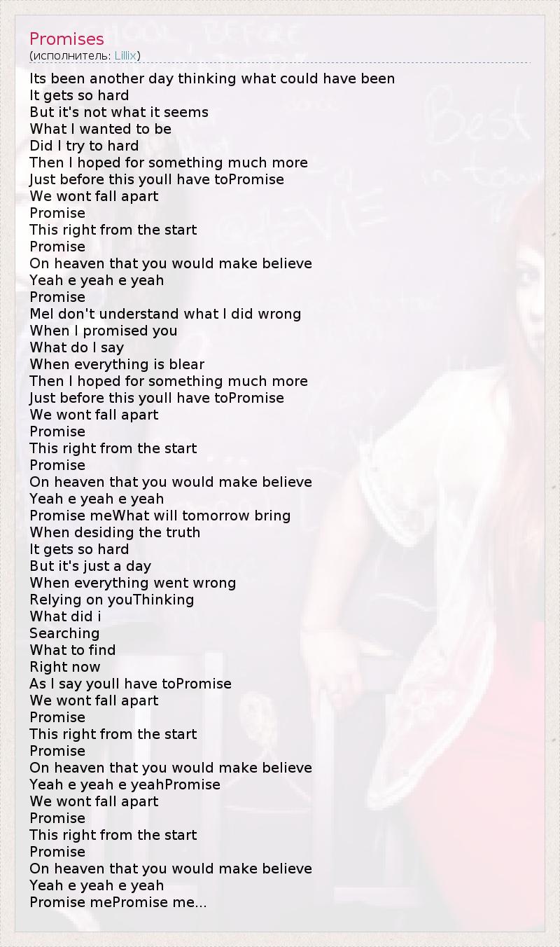 Its been another day thinking what could have been It gets so hard But it's not what it seems What I wanted to be Did I try to hard Then I hoped for something much more Just before this youll have toPromise We wont fall apart Promise This right from the start Promise On heaven that you would make believe Yeah e yeah e yeah Promise MeI don't understand what I did wrong When I promised you What do I say When everything is blear Then I hoped for something much more Just before this youll have toPromise We wont fall apart Promise This right from the start Promise On heaven that you would make believe Yeah e yeah e yeah Promise meWhat will tomorrow bring When desiding the truth It gets so hard But it's just a day When everything went wrong Relying on youThinking What did i Searching What to find Right now As I say youll have toPromise We wont fall apart Promise This right from the start Promise On heaven that you would make believe Yeah e yeah e yeahPromise We wont fall apart Promise This right from the start Promise On heaven that you would make believe Yeah e yeah e yeah Promise mePromise me...