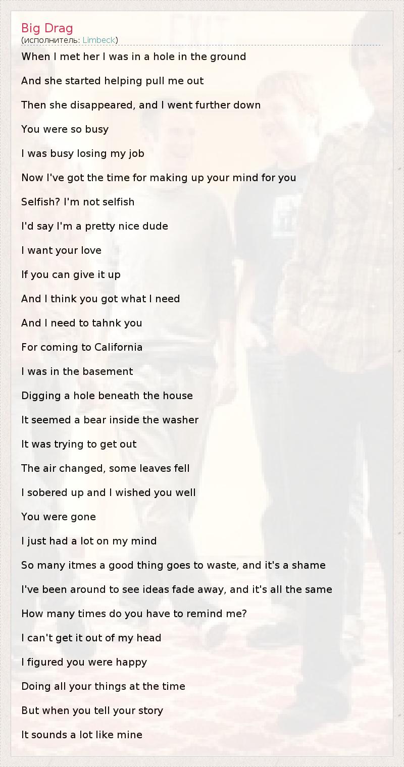 When I met her I was in a hole in the ground And she started helping pull me out Then she disappeared, and I went further down You were so busy I was busy losing my job Now I've got the time for making up your mind for you Selfish? I'm not selfish I'd say I'm a pretty nice dude I want your love If you can give it up And I think you got what I need And I need to tahnk you For coming to California I was in the basement Digging a hole beneath the house It seemed a bear inside the washer It was trying to get out The air changed, some leaves fell I sobered up and I wished you well You were gone I just had a lot on my mind So many itmes a good thing goes to waste, and it's a shame I've been around to see ideas fade away, and it's all the same How many times do you have to remind me? I can't get it out of my head I figured you were happy Doing all your things at the time But when you tell your story It sounds a lot like mine