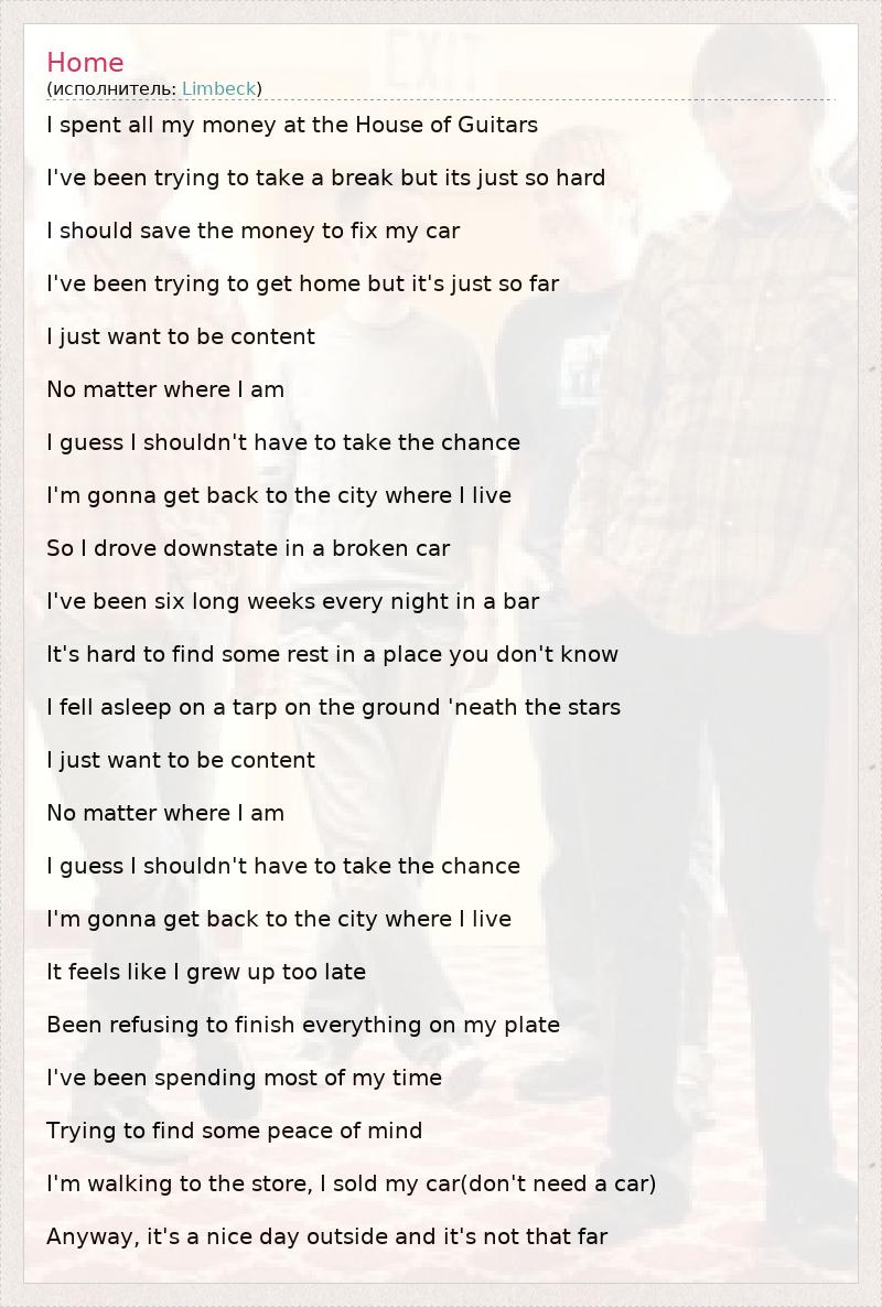 I spent all my money at the House of Guitars I've been trying to take a break but its just so hard I should save the money to fix my car I've been trying to get home but it's just so far I just want to be content No matter where I am I guess I shouldn't have to take the chance I'm gonna get back to the city where I live So I drove downstate in a broken car I've been six long weeks every night in a bar It's hard to find some rest in a place you don't know I fell asleep on a tarp on the ground 'neath the stars I just want to be content No matter where I am I guess I shouldn't have to take the chance I'm gonna get back to the city where I live It feels like I grew up too late Been refusing to finish everything on my plate I've been spending most of my time Trying to find some peace of mind I'm walking to the store, I sold my car(don't need a car) Anyway, it's a nice day outside and it's not that far