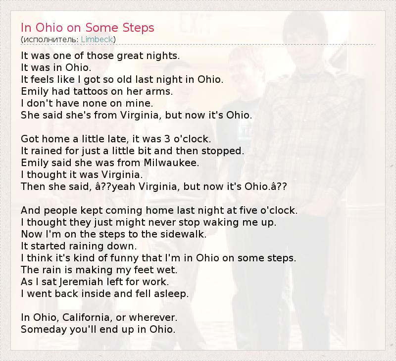 It was one of those great nights. It was in Ohio. It feels like I got so old last night in Ohio. Emily had tattoos on her arms. I don't have none on mine. She said she's from Virginia, but now it's Ohio. Got home a little late, it was 3 o'clock. It rained for just a little bit and then stopped. Emily said she was from Milwaukee. I thought it was Virginia. Then she said, â??yeah Virginia, but now it's Ohio.â?? And people kept coming home last night at five o'clock. I thought they just might never stop waking me up. Now I'm on the steps to the sidewalk. It started raining down. I think it's kind of funny that I'm in Ohio on some steps. The rain is making my feet wet. As I sat Jeremiah left for work. I went back inside and fell asleep. In Ohio, California, or wherever. Someday you'll end up in Ohio.