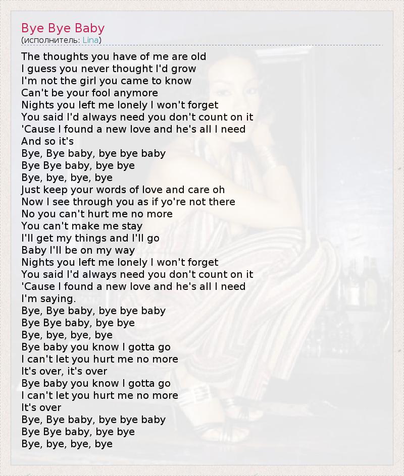 The thoughts you have of me are old I guess you never thought I'd grow I'm not the girl you came to know Can't be your fool anymore Nights you left me lonely I won't forget You said I'd always need you don't count on it 'Cause I found a new love and he's all I need And so it's Bye, Bye baby, bye bye baby Bye Bye baby, bye bye Bye, bye, bye, bye Just keep your words of love and care oh Now I see through you as if yo're not there No you can't hurt me no more You can't make me stay I'll get my things and I'll go Baby I'll be on my way Nights you left me lonely I won't forget You said I'd always need you don't count on it 'Cause I found a new love and he's all I need I'm saying. Bye, Bye baby, bye bye baby Bye Bye baby, bye bye Bye, bye, bye, bye Bye baby you know I gotta go I can't let you hurt me no more It's over, it's over Bye baby you know I gotta go I can't let you hurt me no more It's over Bye, Bye baby, bye bye baby Bye Bye baby, bye bye Bye, bye, bye, bye