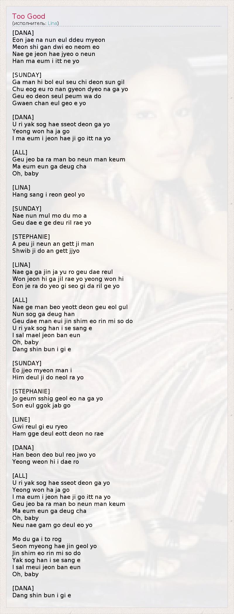 Это интересно:Шелина Уейд (Shelina Wade), больше известна как Lina, американская R&B,soul-певица, автор песен.Lina родилась в штате Колорадо (Denver), выросла в Техасе. В возрасте четырех лет Lina была принята в церковный хор, где и началась ее музыкальная карьера. Впитав в себя лучшее от стилей госпел и джаз, Lina позже подписала свой первый контракт со студией звукозаписи, сначала как автор песен, затем - как певица.... продолжение