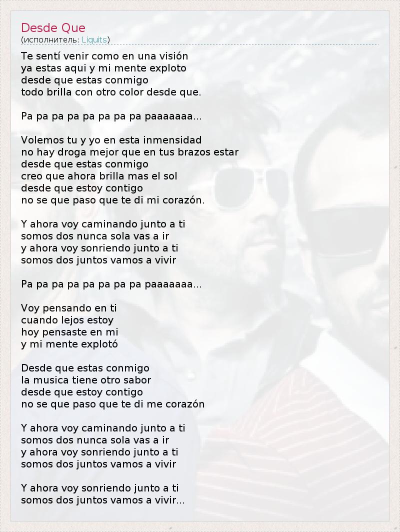 Те SENTi venir Комо ан уна Visión я Estas Aqui у миль Mente exploto Desde дие Estas Conmigo TODO Brilla кон другое одно цвет Desde дие . Па годовых годовых годовых годовых годовых годовых годовых paaaaaaa ... Volemos ту у лет ан Эста inmensidad нет сена Droga Mejor дие ан ЕП Brazos ЭСТАР Desde дие Estas Conmigo Creo дие Ahora Brilla Рождество El Sol Desde дие Estoy Contigo нет таковой дие Пасо дие те ди миль corazón . У Ahora Voy Caminando Junto титан Somos дос Nunca Сола VAS л а ж у Ahora Voy sonriendo Junto титан Somos дос Juntos VamosVivir Па годовых годовых годовых годовых годовых годовых годовых paaaaaaa ... Вой pensando ан ти Квандо Lejos Estoy хой pensaste ан миль у миль Mente explotó Desde дие Estas Conmigo La Musica Tiene другое одно Sabor Desde дие Estoy Contigo нет таковой дие Пасо дие те ди меня corazón У Ahora Voy Caminando Junto титан Somos дос Nunca Сола VAS л а ж у Ahora Voy sonriendo Junto титан Somos дос Juntos VamosVivir У Ahora Voy sonriendo Junto титан Somos дос Juntos VamosVivir ...
