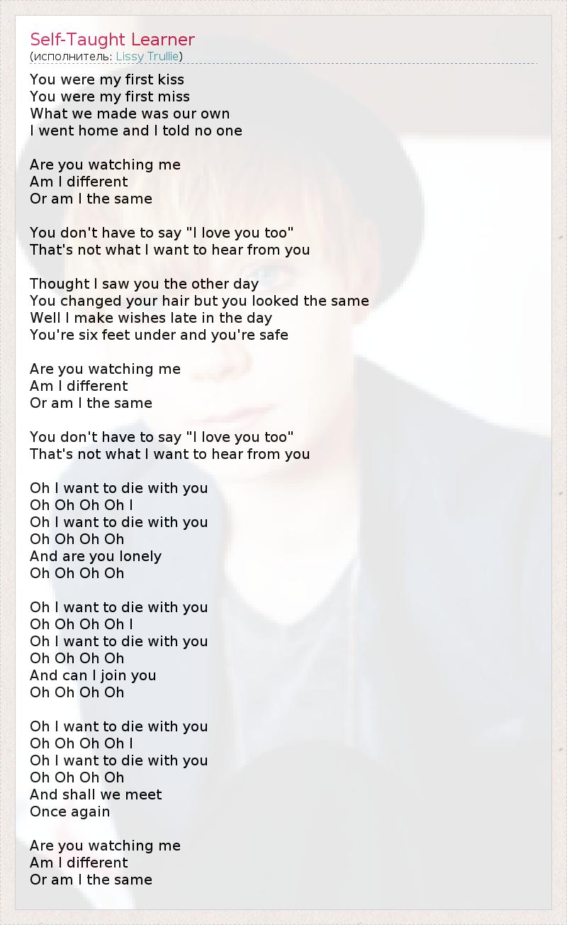 You were my first kiss You were my first miss What we made was our own I went home and I told no one Are you watching me Am I different Or am I the same You don't have to say "I love you too" That's not what I want to hear from you Thought I saw you the other day You changed your hair but you looked the same Well I make wishes late in the day You're six feet under and you're safe Are you watching me Am I different Or am I the same You don't have to say "I love you too" That's not what I want to hear from you Oh I want to die with you Oh Oh Oh Oh I Oh I want to die with you Oh Oh Oh Oh And are you lonely Oh Oh Oh Oh Oh I want to die with you Oh Oh Oh Oh I Oh I want to die with you Oh Oh Oh Oh And can I join you Oh Oh Oh Oh Oh I want to die with you Oh Oh Oh Oh I Oh I want to die with you Oh Oh Oh Oh And shall we meet Once again Are you watching me Am I different Or am I the same