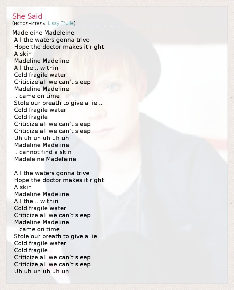 Madeleine Madeleine All the waters gonna trive Hope the doctor makes it right A skin Madeline Madeline All the .. within Cold fragile water Criticize all we can't sleep Madeline Madeline .. came on time Stole our breath to give a lie .. Cold fragile water Cold fragile Criticize all we can't sleep Criticize all we can't sleep Uh uh uh uh uh uh Madeline Madeline .. cannot find a skin Madeleine Madeleine All the waters gonna trive Hope the doctor makes it right A skin Madeline Madeline All the .. within Cold fragile water Criticize all we can't sleep Madeline Madeline .. came on time Stole our breath to give a lie .. Cold fragile water Cold fragile Criticize all we can't sleep Criticize all we can't sleep Uh uh uh uh uh uh
