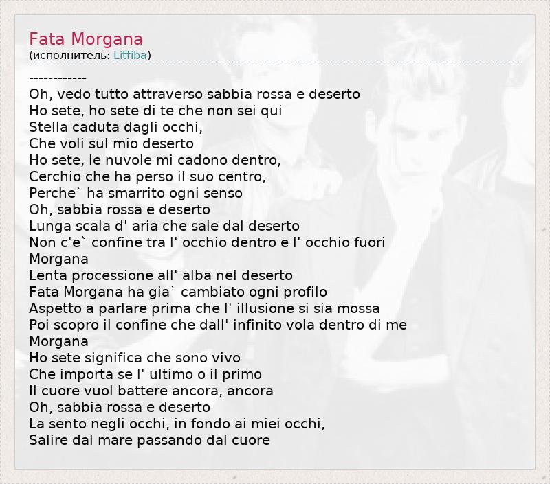 ------------ Oh, vedo tutto attraverso sabbia rossa e deserto Ho sete, ho sete di te che non sei qui Stella caduta dagli occhi, Che voli sul mio deserto Ho sete, le nuvole mi cadono dentro, Cerchio che ha perso il suo centro, Perche` ha smarrito ogni senso Oh, sabbia rossa e deserto Lunga scala d' aria che sale dal deserto Non c'e` confine tra l' occhio dentro e l' occhio fuori Morgana Lenta processione all' alba nel deserto Fata Morgana ha gia` cambiato ogni profilo Aspetto a parlare prima che l' illusione si sia mossa Poi scopro il confine che dall' infinito vola dentro di me Morgana Ho sete significa che sono vivo Che importa se l' ultimo o il primo Il cuore vuol battere ancora, ancora Oh, sabbia rossa e deserto La sento negli occhi, in fondo ai miei occhi, Salire dal mare passando dal cuore